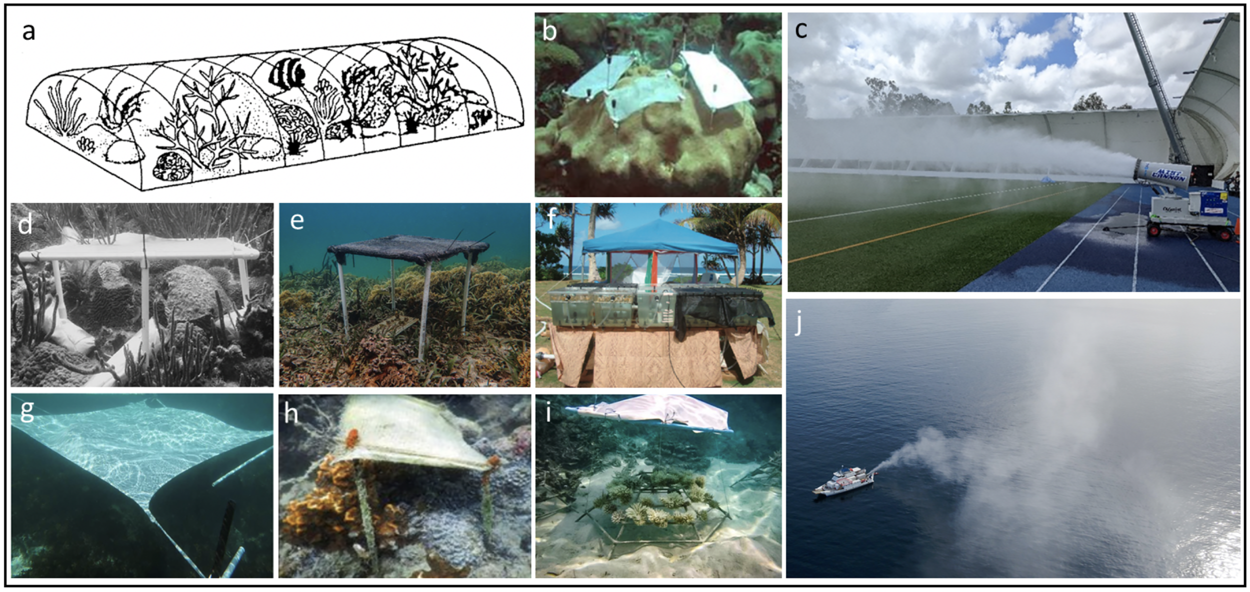 Different types of shade used in diverse coral reefs shading experiments. (A) Diagram showing a 20 m2 black plastic shade deployed for five weeks to investigate the effects of extreme turbidity on coral reefs structure (Rogers, 1979); (B) 13 x 8 cm wire mesh shades deployed for 11 days to investigate the effects of surface temperature and decreasing irradiance on cellular response (Piggot et al., 2009); (C) proof of concept fog cannon (with 100 impact pin nozzle) being tested (October, 2021) for the fogging development, as part of the Reef Restoration and Adaptation Program (Baker et al., 2021, picture: Joel Alroe); (D) smoked plastic on a polyvinyl chloride reducing 20% UVR and 65% PAR to effectively reduce white-plague disease in the Caribbean (Muller and van Woesik, 2009); (E) double layer 40% sun-block shade cloth deployed for 3 months in Panama, looking at the effects of low light environments (i.e. mangroves) as coral refugia (Stewart et al., 2021); (F) Outdoor experiment showing some tanks exposed to sunlight and other tanks covered with knitted black polyethylene fabric shade that reduced 75 and 50% respectively; (G) square-shaped shade sails of 4m2 and 9m2 and >98% UV-blockage certified deployed for 48 days to reduce macroalgal growth on degraded coral reefs; (H) Cotton lined fine white fabric deployed over a year to reduce the progression of coral-killing sponge in Palk Bay, India (Thinesh et al., 2017); (I) shading device utilised in the Maldives to protect bleached corals on a coral propagation project at Maldives (Marine Saver – Reefscapers); (J) cloud and sky brightening field trials at the Great Barrier Reef (March, 2021) testing the V22 cannon with 320 nozzles, as part of the Reef Restoration and Adaptation Program (picture: Brendan Kelaher).