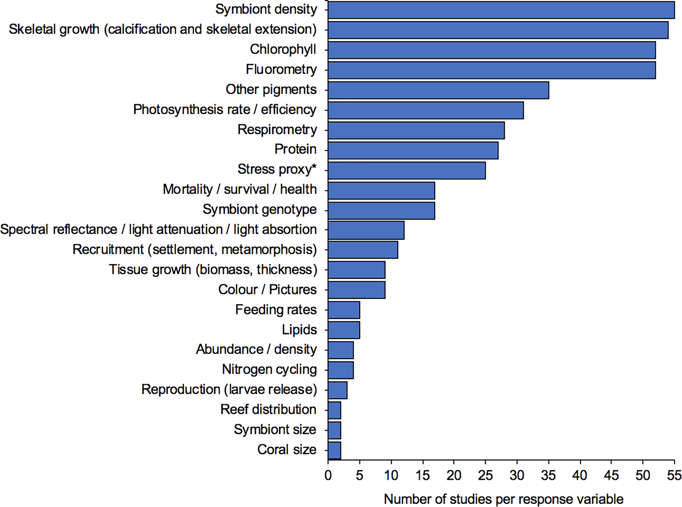 Different response variables investigated on studies looking at the effects of shade/light on coral. *stress proxies include reactive oxygen species (ROS), catalase activity (CAT), lipid peroxidation (LPO), superoxide dismutase (SOD), mycosporine-like amino acids (MAA), Non-enzymatic total antioxidant capacity (TAC), Protein tyrosine nitration (PTN), enzyme linked immunosorbent assays (ELISAs), ascorbate peroxidase (APX). Isolated response variables (<1) were not included (e.g. communication damage, coral surface warming, behaviour, phosphorous excretion, etc.).