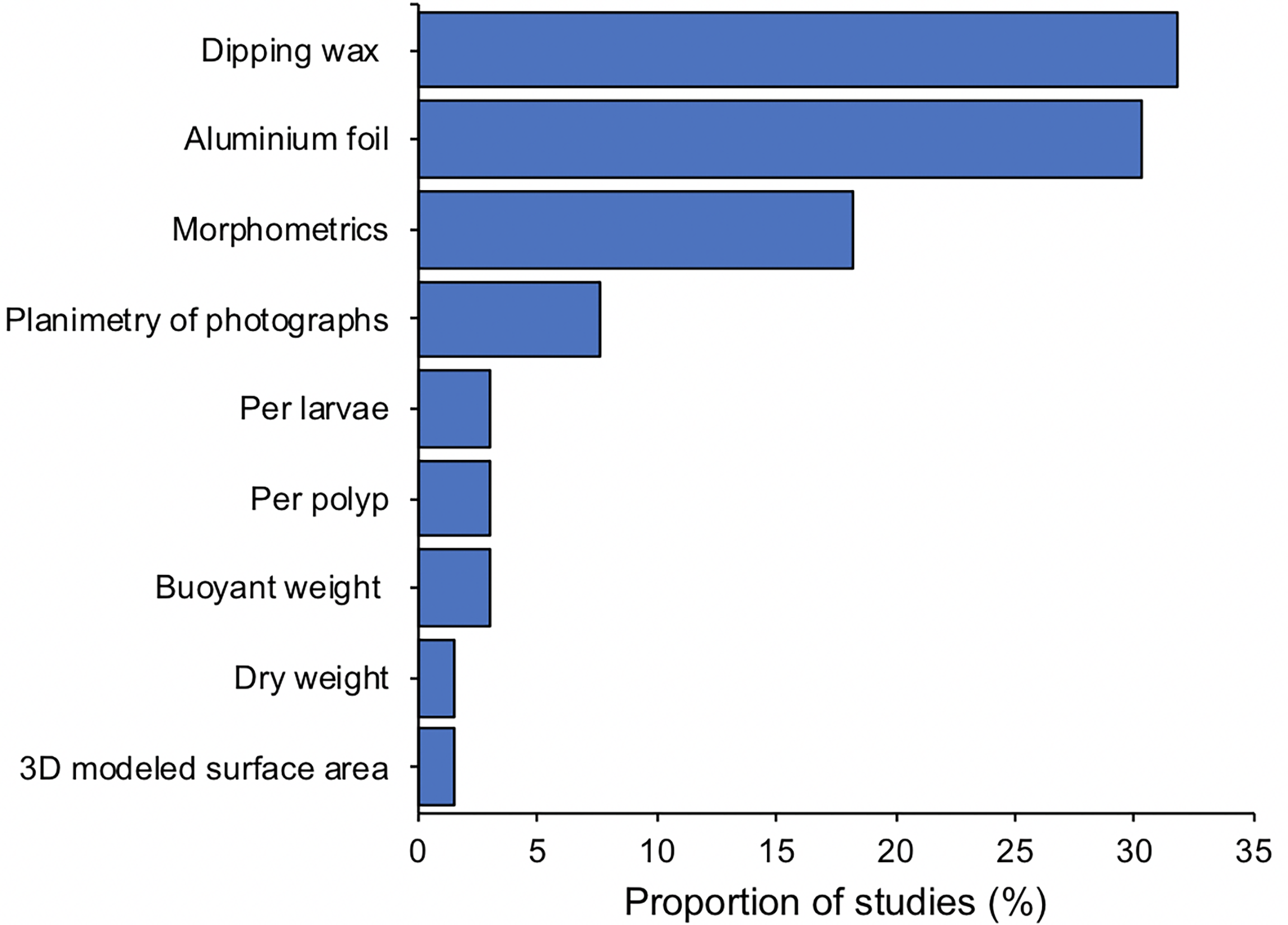 Our review identified at least 30 different response variables measured to assess the effects of shade and light on corals. Four of them (symbiont density, skeletal growth, fluorometry normally measured with PAM and chlorophyll levels) were each used in at least 50 studies. Figure 5 shows 23 of those response variables identified. As previously reported by McLachlan et al. (2020), one of the principal challenges in comparing coral studies is the variety of standardisation methods used. Here, we observed at least nine different methods used to standardise coral response variables (Figure 6). Most studies standardise data with respect to surface area (89%), however surface area has been quantified by at least five different methods (i.e., dipping wax, aluminium foil, morphometrics of a cylinder or a circle/core, planimetry of pictures, and 3D modelled area). Further standardisation methods for corals included the use of buoyant weight, dry weight, number of polyps and number of larvae. The wide variety of methods are not directly comparable and create uncertainty when comparing among studies. Encouraging the uniform adoption of preferred standardization methods would be worthwhile.