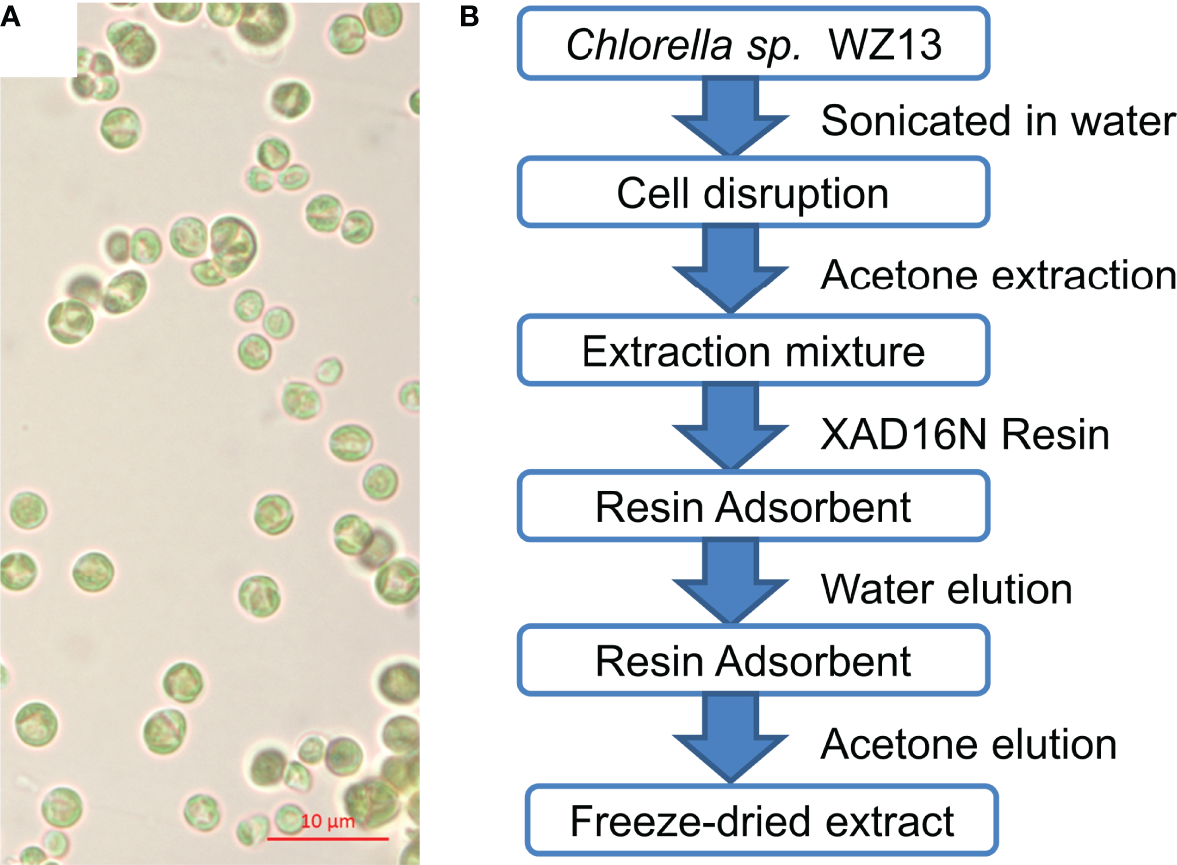 Morphology of microalgae Chlorella sp. WZ13 and illustration of the process used to obtain the freeze-dried algal extract (CSE-WZ13). (A) Microscopic observation of Chlorella sp. WZ13 (under mineral oil 100× magnification; scale bar = 10 µm). (B) Extraction steps performed to obtain the freeze-dried extract CSE-WZ13 from Chlorella sp. WZ13.