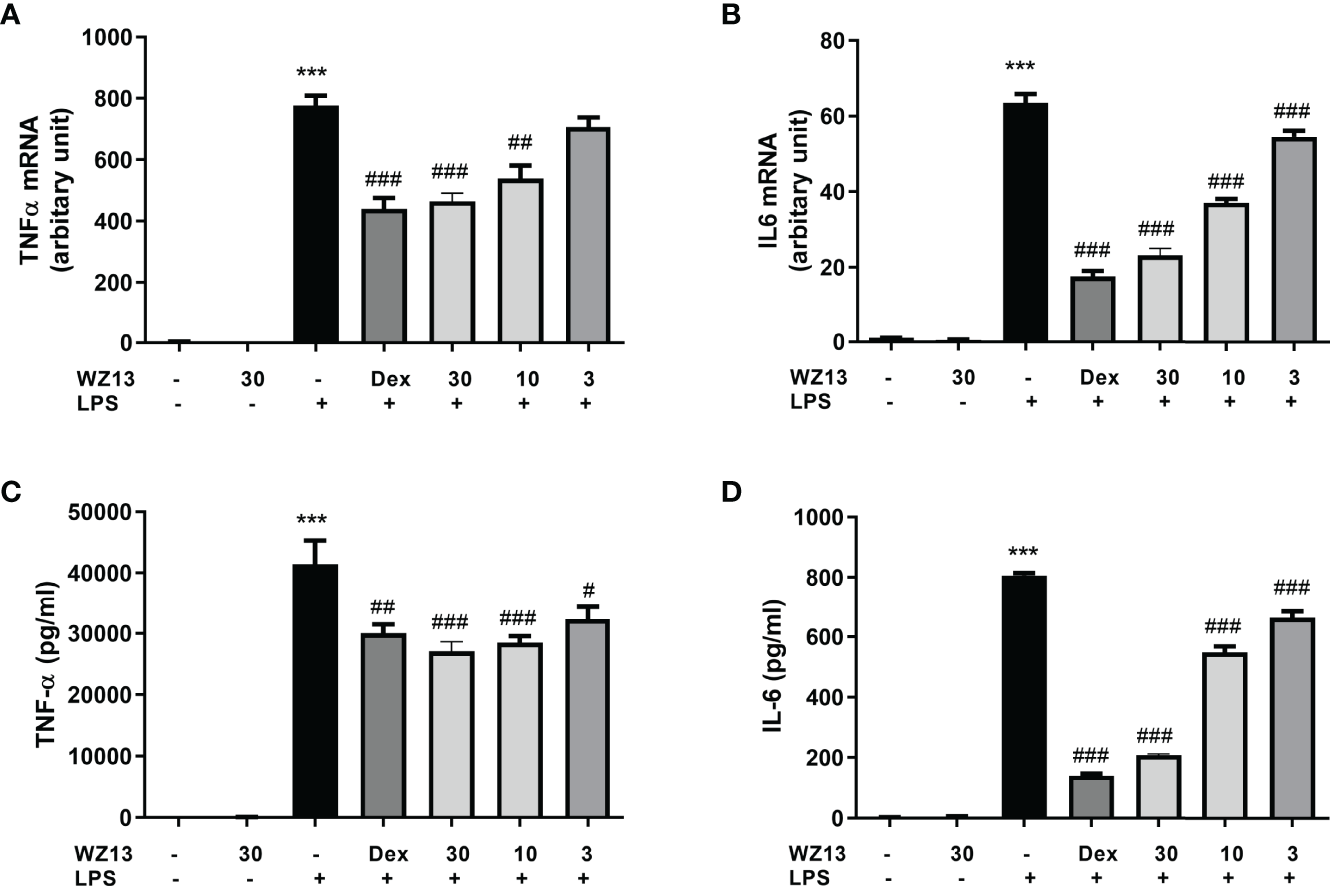 Anti-inflammatory effects of CSE-WZ13 (WZ13) and dexamethasone (Dex, 5 µg/ml) on RAW264.7 cells. The mRNA expression of TNF-α (A) and IL-6 (B) in LPS-treated RAW264.7 cells. Pro-inflammatory mediators TNF-α (C) and IL-6 (D) in the supernatant of LPS-treated RAW264.7 cells. Data are presented as mean ± SEM (n=3) ***P < 0.001 compared with the vehicle-treated group, #P < 0.05, ##P < 0.01, ###P < 0.001 compared with the LPS-treated group.
