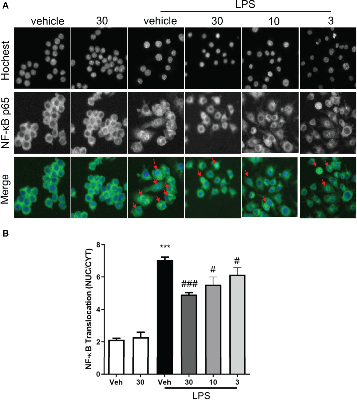 CSE-WZ13 inhibited the translocation of NF-κB from the cytoplasm to the nucleus in LPS treated RAW264.7 cells. (A) Representative pictures from the DAPI (Hochest 33342) and FITC (NF-κB p65) channel, the red arrows show the entry of NF-κB p65 into the nucleus. (B) The average pixel intensity was measured in the nucleus and cytoplasm of each cell, and a translocation value was calculated by NUC/CYT. Data are presented as mean ± SEM (n=8) ***P < 0.001 compared with the vehicle-treated group, #P < 0.05, ###P < 0.001 compared with the LPS-treated vehicle group.