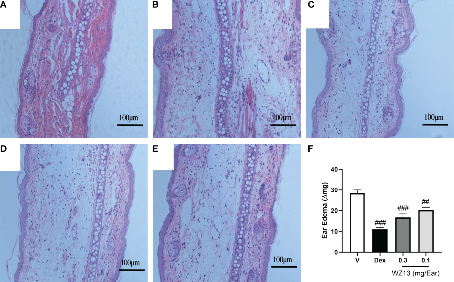 CSE-WZ13 inhibited ear edema in mice treated with TPA. Representative images of histological transversal cuts of mouse ears and analysis of alterations induced by (A) vehicle, (B) TPA, (C) 0.1 mg/ear dexamethasone (Dex), (D) 0.3 mg/ear CSE-WZ13, and (E) 0.1 mg/ear CSE-WZ13; (F) ear edema as measured by ear weight. Data are presented as mean ± SEM (n=8) ###P < 0.001, ##P< 0.01 compared with vehicle-treated group.