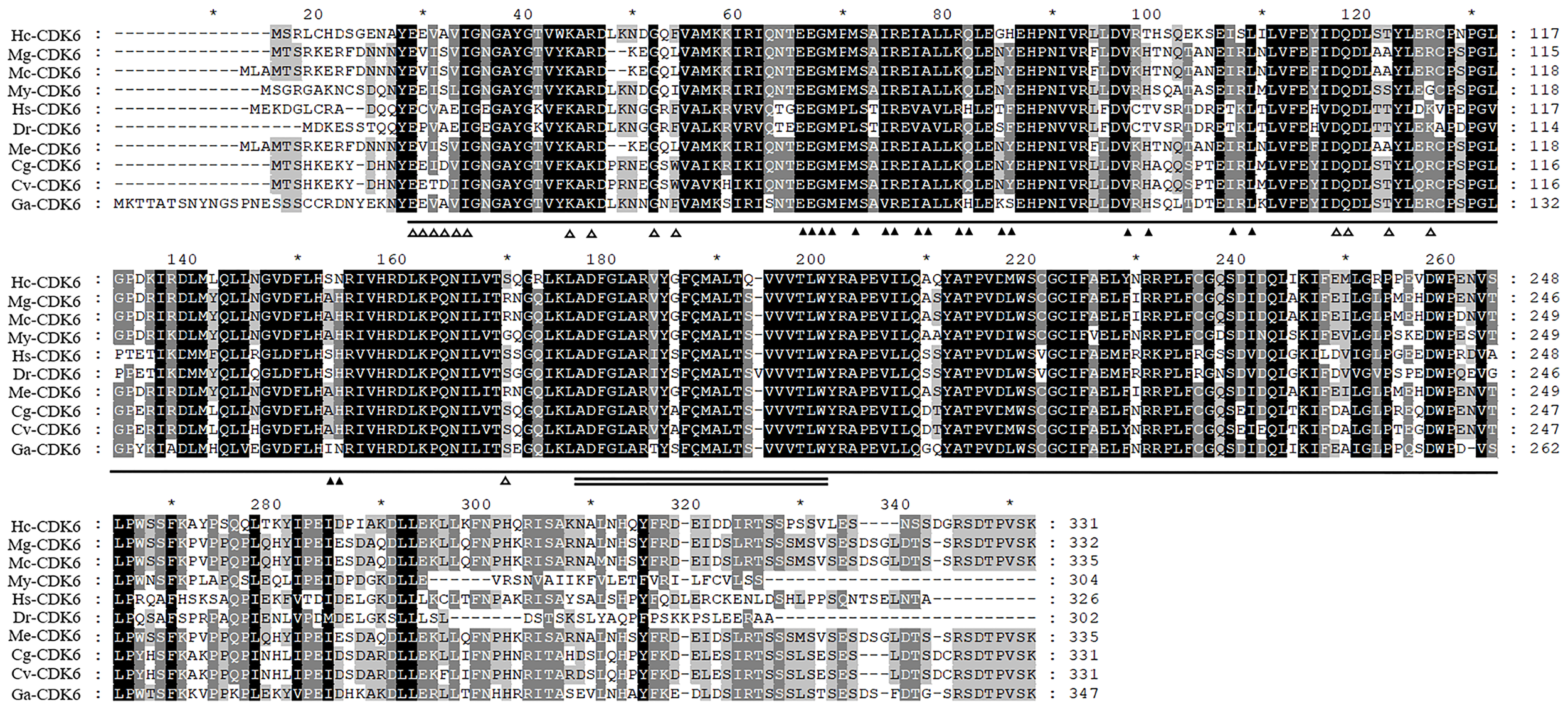 Alignment analysis of Hc-CDK6 with homologous sequences in other species. â–²Indicates the amino acid residue of CDK binding to CCND, â–³indicates the amino acid residue of CDK binding to INK4, a horizontal line indicates the catalytic domain of cyclin-dependent kinase 4 and 6-like serine/threonine kinases of CDK6, and the double solid line indicates the activation loop (A-loop). GenBank accession numbers: Mytilus galloprovincialis (Mg), VDI04144.1; Mytilus coruscus (Mc), CAC5413630.1; Mizuhopecten yessoensis (My), XP_021356142.1; Homo sapiens (Hs), NP_001138778.1; Danio rerio (Dr), NP_001137525.1; Crassostrea gigas (Cg), XP_011426627.1; Crassostrea virginica (Cv), XP_022322423.1; Gigantopelta aegis (Ga), XP_041371365.1; Mytilus edulis (Me), CAG2221073.1. Black, conserved amino acid residue; gray, analogous residues. * Indicates that starting from the 10th amino acid, every 20 amino acids are marked with a *.