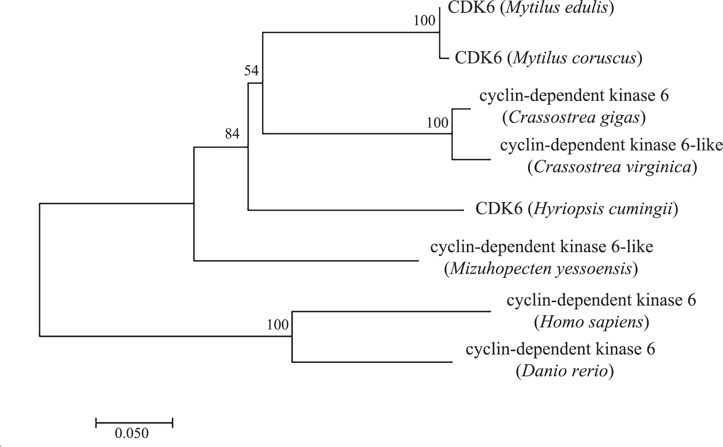 Amino acid comparison indicated 75% sequence identity with Mizuhopecten yessoensis CDK6, 75.23% with Crassostrea gigas CDK6 and 74.61% with Crassostrea virginica CDK6 (Figure 2). The phylogenetic tree was constructed with MEGA7.0 (Figure 3), and the Hc-CDK6 amino acid sequence was compared with other available CDK6 sequences. The phylogenetic tree showed that Hc-CDK6 clustered with other marine bivalve sequences.