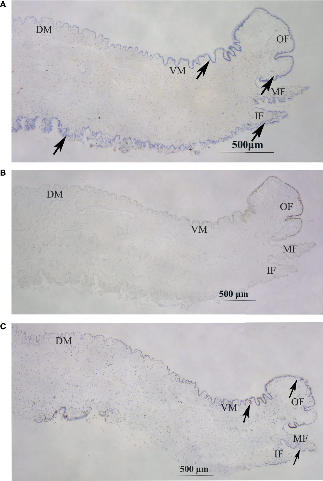 In situ hybridization in the mantle of H. cumingii.(A) Signal of Hc-CDK6 in the experimental groups. (B) Micrograph of the control groups. (C) Signal of Hc-CCND2 in experimental groups. The arrow indicates the position of the signal. OF, outer fold; MF, middle fold; IF, inner fold; DM, dorsal mantle; VM, ventral mantle.