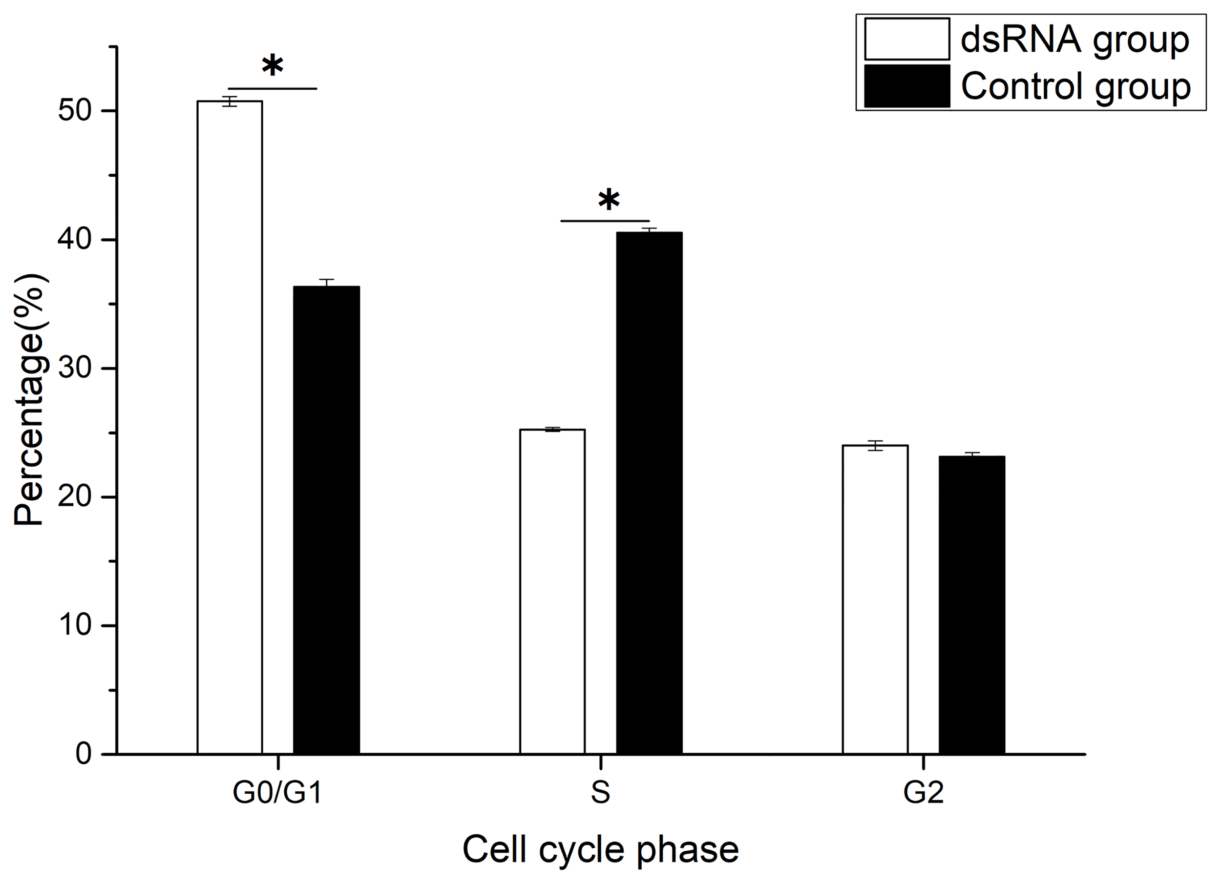 Cell cycle phase distribution of gill cells in Hyriopsis cumingii after Hc-CDK6 RNAi, *Significant difference (P < 0.05), Maximum value of vertical axis is 100%.