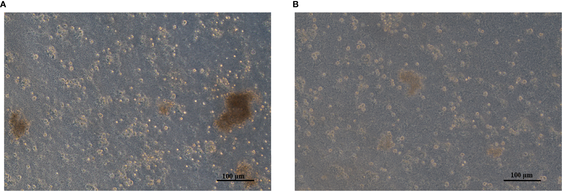 (A) Adherent mantle cells in the pcDNA3.1-CDK6 transfection group. (B) Mantle cells in the control group.