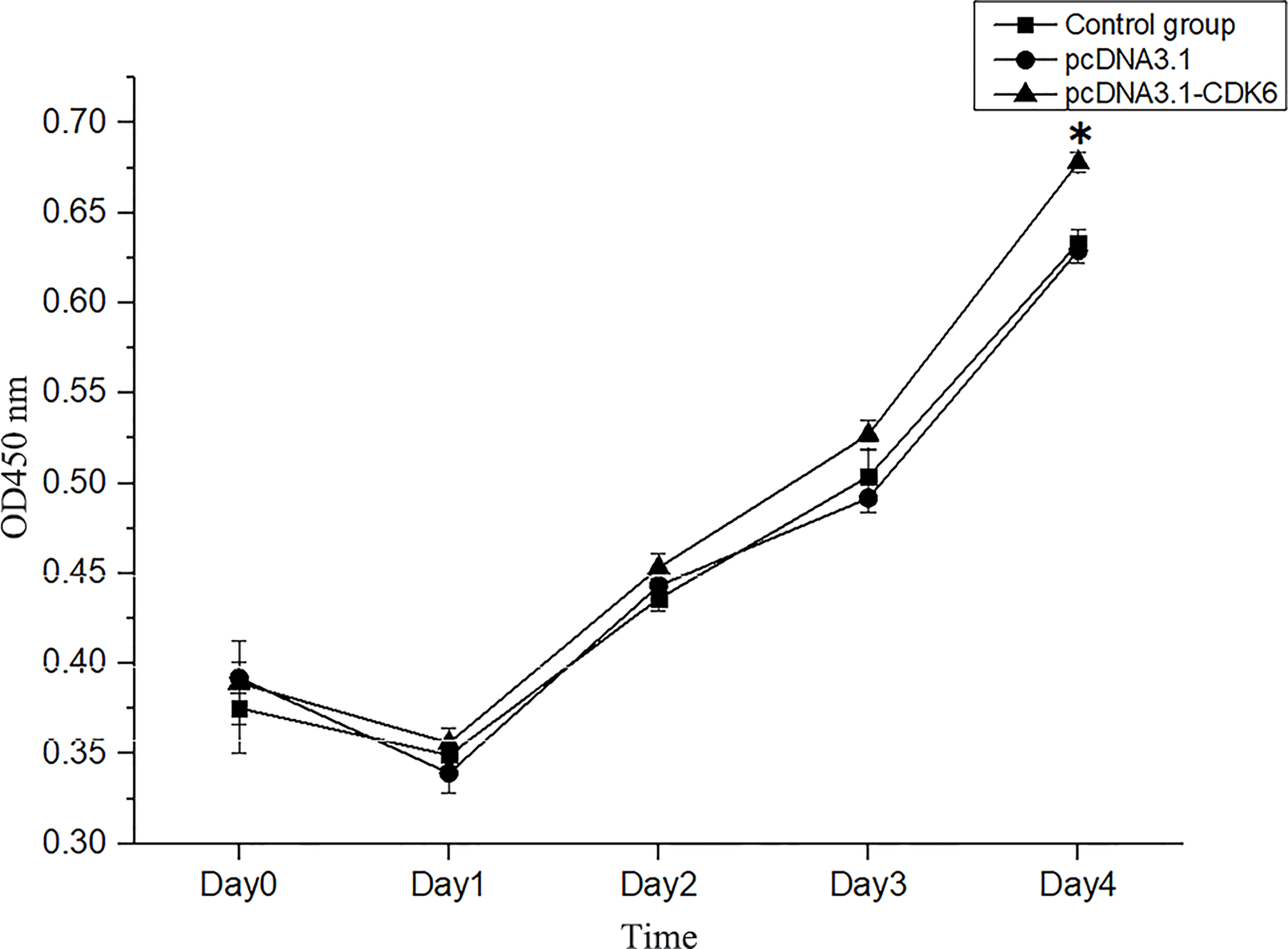 Cell viability assays of transfected and normal H. cumingii mantle cells cultured for 0Â d, 1Â d, 2Â d, 3Â d and 4Â d. *Indicates a significant difference.