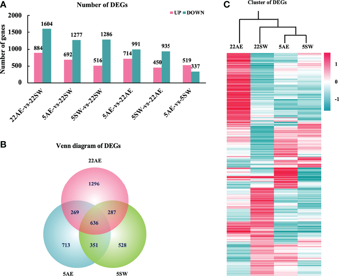 Differentially expressed genes (DEGs) among the four experimental groups of eastern oysters. (A), Number of DEGs between pairs of four groups: seawater at 22°C (22SW, control), exposure to air at 22°C (22AE), seawater at 5°C (5SW) and exposure to air at 5°C (5AE); (B), Venn diagram of DEGs between the three stress conditions and the control 22SW condition; (C), hierarchical clustering of the expression of the top 1000 DEGs in the four groups. The colour range indicates the log10normalized (read count+1) values from high (red, the maximum value is 8.14) to low (green, the minimum value is -6.82).