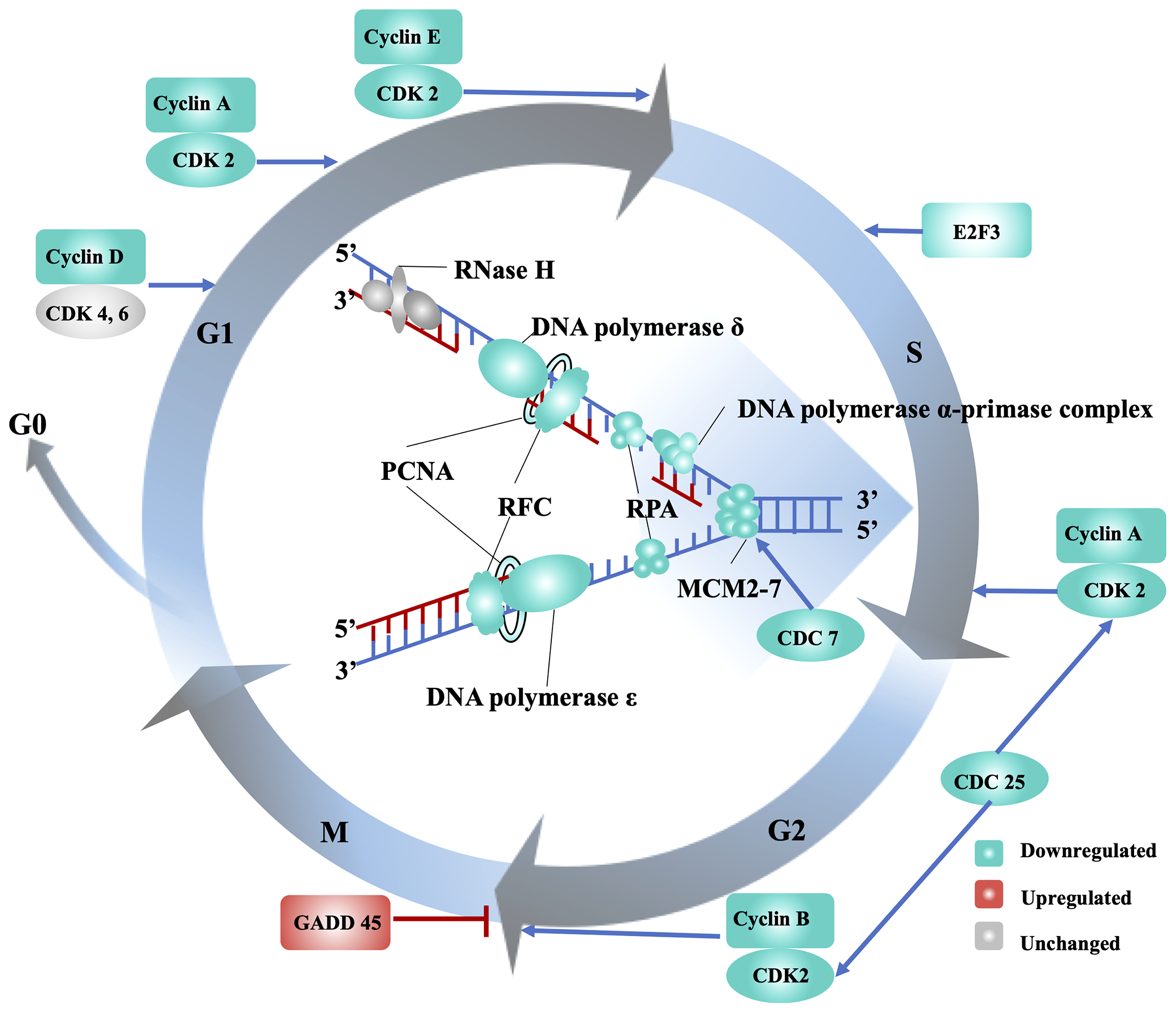 Transcriptional regulation of the cell cycle and DNA replication in eastern oysters under stress. The gene names are the following: CDC, cell division cycle-related protein kinase; CDK, cyclin-dependent kinase; E2F, transcription factor E2F3; GADD 45, growth arrest and DNA damage-inducible protein 45; MCM2-7, minichromosome maintenance proteins; PCNA, proliferating cell nuclear antigen; RFC, replication factor C; RPA, replication protein A.