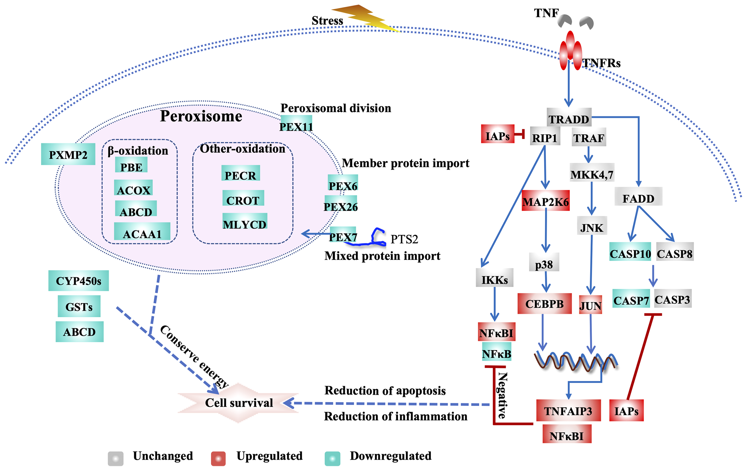 Transcriptional regulation of apoptosis, TNF signalling and peroxisomal activity in eastern oysters during exposure to air. The key genes are the following: ABCD, ATP-binding cassette subfamily D; ACAA1, 3-ketoacyl-CoA thiolase A, peroxisomal; ACOX1, peroxisomal acyl-coenzyme An oxidase 1; NUDT19, nucleoside diphosphate-linked moiety X motif 19; JUN, Jun proto-oncogene, AP-1 transcription factor subunit; CASP7, caspase-7; CASP10, caspase-10; CEBP, CCAAT/enhancer-binding protein; CYP450s, cytochrome P450s; CROT, peroxisomal carnitine O-octanoyltransferase; GSTs, glutathione S-transferases; IAP, inhibitor of apoptosis; TNFR, tumour necrosis factor receptor; MAP2K6, dual specificity mitogen-activated protein kinase 6; NFKBIA, NF-kappa-B inhibitor alpha-like; NFKB, nuclear factor NF-kappa-B p105; PEX7, peroxisomal targeting signal 2 receptor; PEX26, peroxisome assembly protein 26; PEX6, peroxisome assembly factor 2; PEX11, peroxisomal membrane protein 11; PXMP2, peroxisomal membrane protein 2; PECR, peroxisomal trans-2-enoyl-CoA reductase-like; PIK3, phosphatidylinositol-4,5-bisphosphate 3-kinase; TNFAIP3, tumour necrosis factor alpha-induced protein 3.