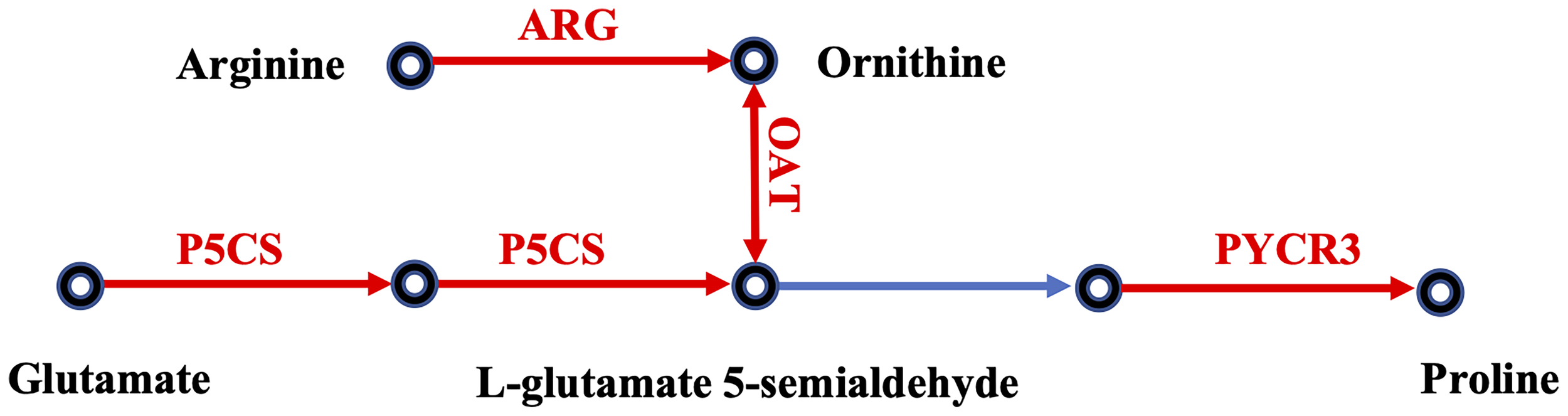 Effects of cold stress on the proline accumulation pathway in eastern oysters. The genes in red exhibit upregulated expression. The gene names are the following: P5CS, delta-1-pyrroline-5-carboxylate synthase; PYCR, pyrroline-5-carboxylate reductase; ARG, arginase; OAT, ornithine aminotransferase.