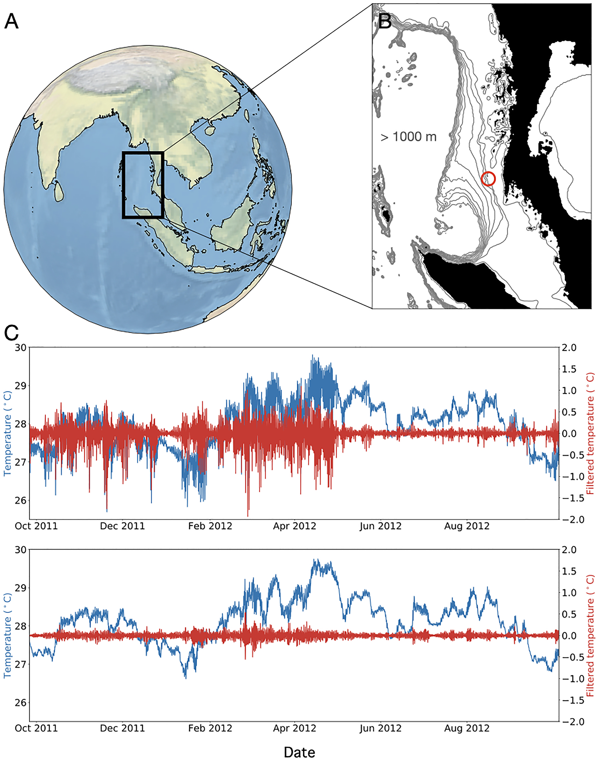 Wall et al. (2015) placed Onset HOBO temperature loggers on the continental shelf in the Andaman Sea (Figures 1A, B) and documented how reefs exposed to cooling associated with large-amplitude internal waves (LAIW) escaped coral bleaching during a regional warming event. They provided a striking comparison between the temperature variability observed on the sides of Ko Miang (8.57˚ N, 97.64˚ E) that are exposed to and sheltered from LAIW. Their temperature records also showed a significant decrease in variability from the first half of the year (January to June) to the second half.