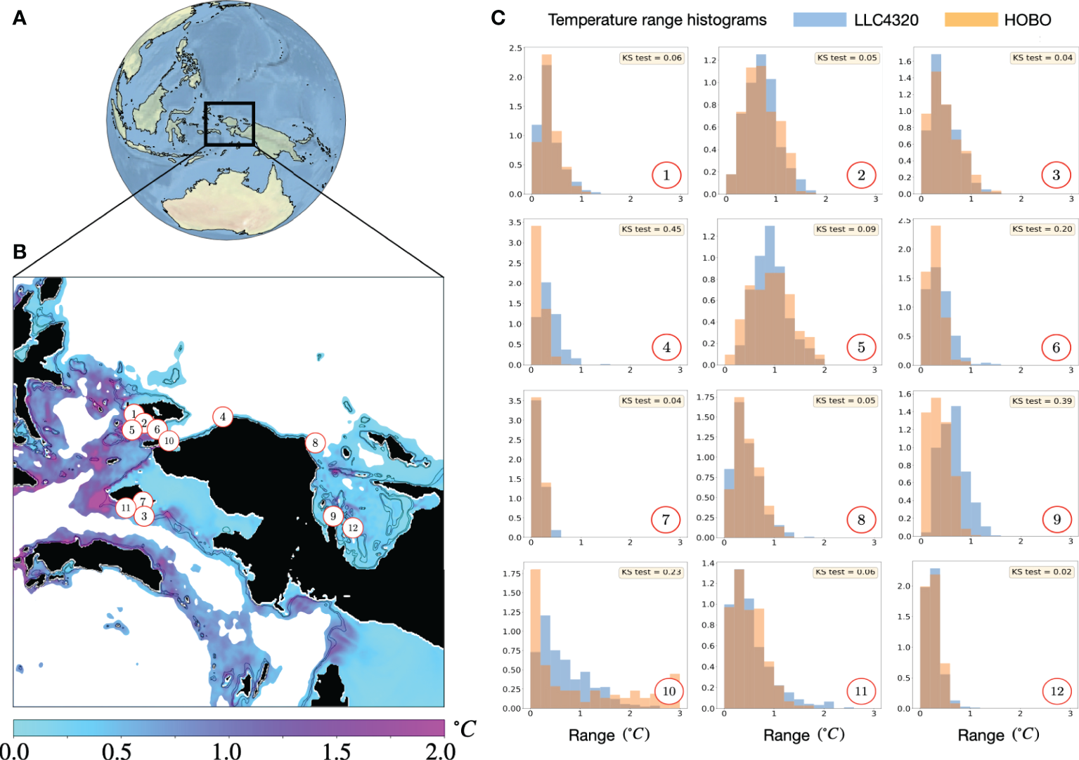 We also performed model-observation comparisons against HOBO temperature logger data collected in the Coral Triangle between 2011 and 2012 (Figure 2). Twelve HOBO temperature sensors were distributed at 20 m depth on multiple reefs around West Papua, Indonesia (1.03˚ S, 130.51˚ E) (Figures 2A, B), each logging temperature measurements every 15 minutes. The data were high-pass filtered using the procedure described in the Materials and Methods section, and the daily range of the filtered data was assembled into a time series spanning the full year.