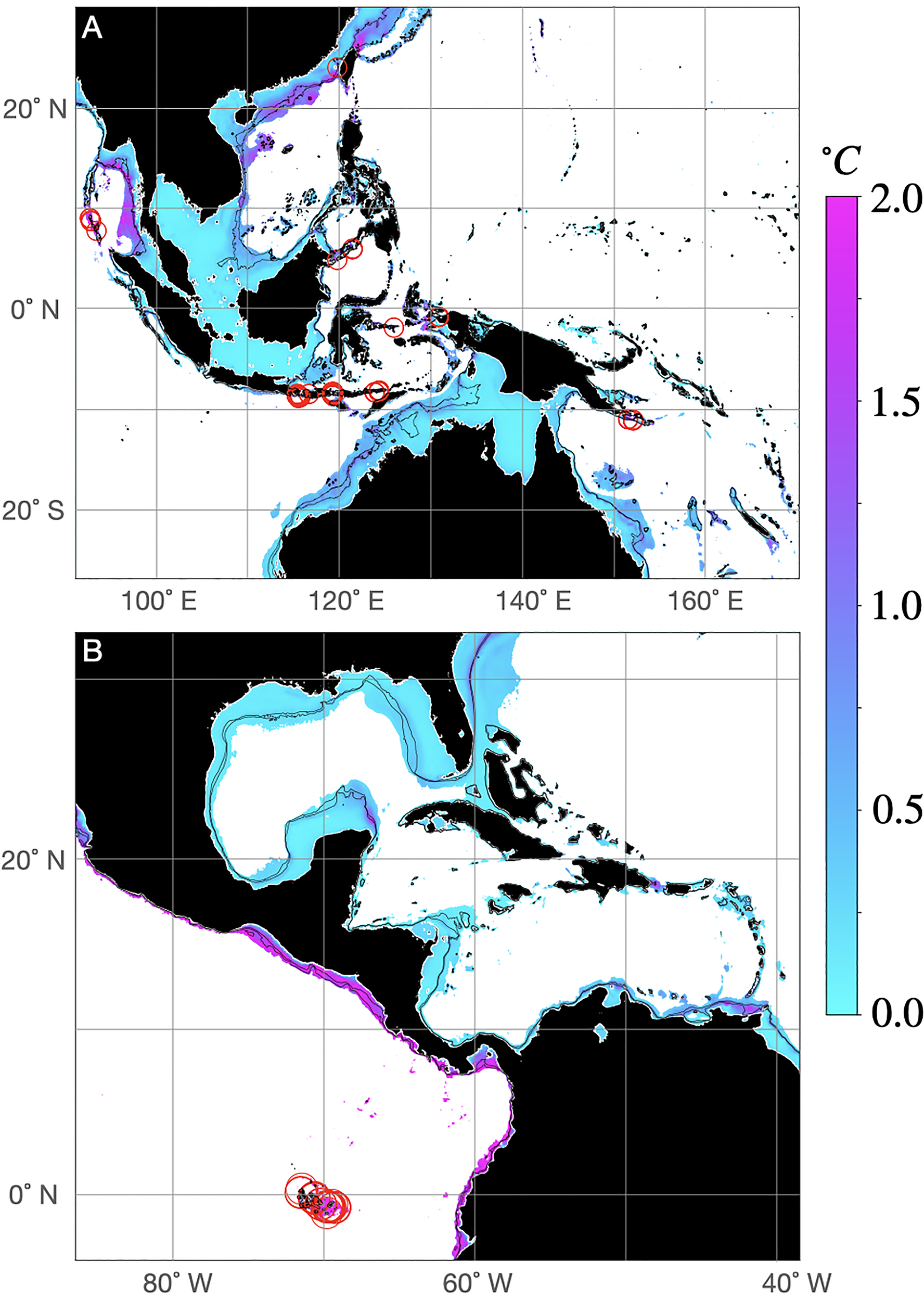 Mean daily temperature range at 50 m depth, shown only for locations shallower than 1000 m in (A) the western Pacific and (B) eastern Pacific/Caribbean. The 100m and 200m isolines are indicated by thin black lines. Red circles indicate locations where the daily temperature range at 10m depth exceeds 2.5°C.