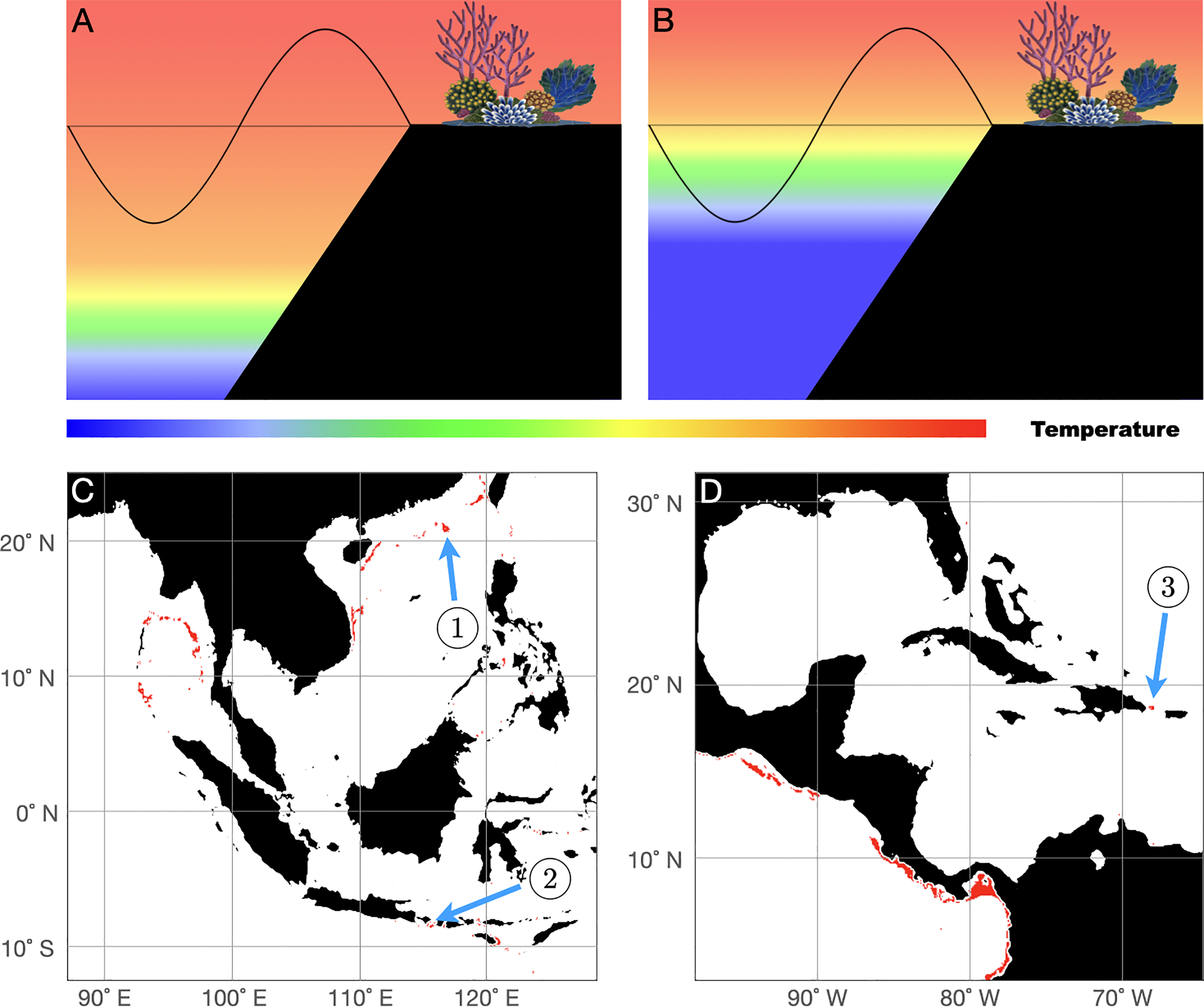 (A) A tidally-generated internal wave near a shallow water coral reef oscillates over a smaller range of temperatures when the mixed layer is deep versus (B) when it is shallow. (C, D) Selected locations where the difference between the maximum and minimum monthly-averaged daily range in temperature at 10 m depth exceeds 1°C, indicated in red. Specific locations highlighted in Figure 5 are indicated by blue arrows. ①: Dongsha Atoll; ②: Lombok Strait; ③: Mona Passage.