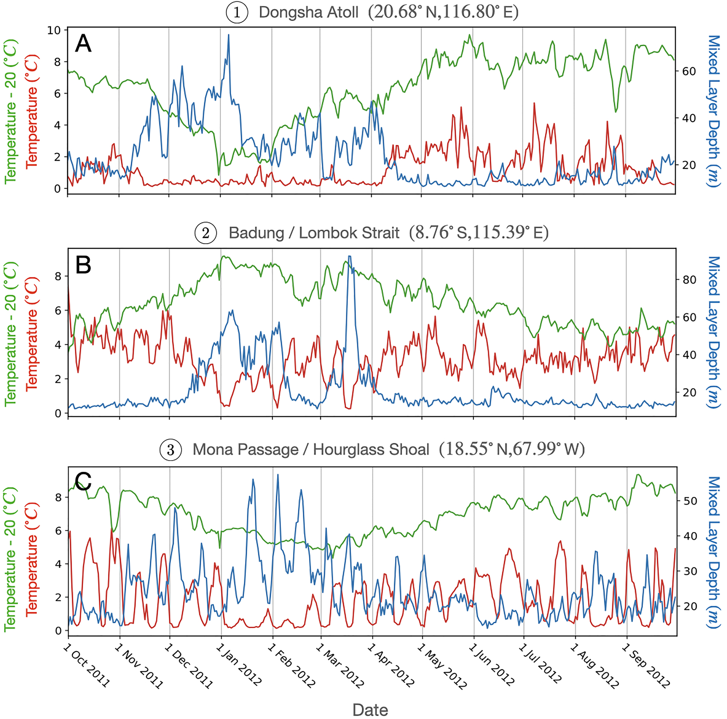 Figure 5 shows time series of the mixed layer depth (MLD, blue), daily range of sea surface temperature (SST, green), and daily temperature range at 10 m depth over the full study period at each of these locations. A common feature at all three locations is an obvious negative correlation between the MLD and the daily temperature range at 10 m. When the mixed layer deepens the temperature variability is reduced, though the behavior at each location ranges from the variability being essentially shut off completely (Dongsha Atoll, Figure 5A) to being only slightly affected (Lombok Strait, Figure 5B). Interestingly, the plots differ in terms of the timescales over which this negative correlation holds. For example, Dongsha Atoll shows a very weak correlation at short timescales but a period of several months where the mixed layer is deep, and the variability is minimal (and vice versa). Lombok Strait also tends to show low correlation at short timescales except for three very conspicuous events between January 2012 and April 2012 where the mixed layer became very deep, and the temperature variability drops nearly to zero. Historical weather data from the region indicates that these events coincided with strong precipitation and thunderstorms1.