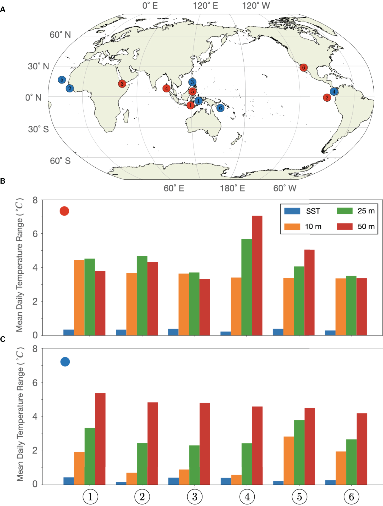 (A) Locations with largest mean daily temperature range at 10 m (red) and 50 m (blue) depths. Temperature ranges at the sea surface, 10 m, 25 m, and 50 m are shown for the red locations in (B) and blue locations in (C). Red: ①: Sape Strait, 8.56° S 119.23° E, ②: Galápagos Islands, 0.96° S 89.59° W, ③: Bab al-Mandab Strait, 12.64° N 43.39° E, ④: Andaman-Nicobar Ridge, 8.79° N 92.86° E, ⑤: Sulu Archipelago, 6.02° N 121.44° E, ⑥: Sea of Cortez, 28.76° N 112.49° W Blue: ①: Manipa Strait, 3.16° S 127.82° E, ②: Sierra Leone Rise, 8.35° N 14.32° W, ③: Verde Island Passage, 13.58° N 121.09° E, ④: Panama Fracture Zone, 5.20° N 81.93° W, ⑤: Cape Verde Islands, 16.63° N 24.61° W, ⑥: Pocklington Trough, 11.22° S 152.09° E.