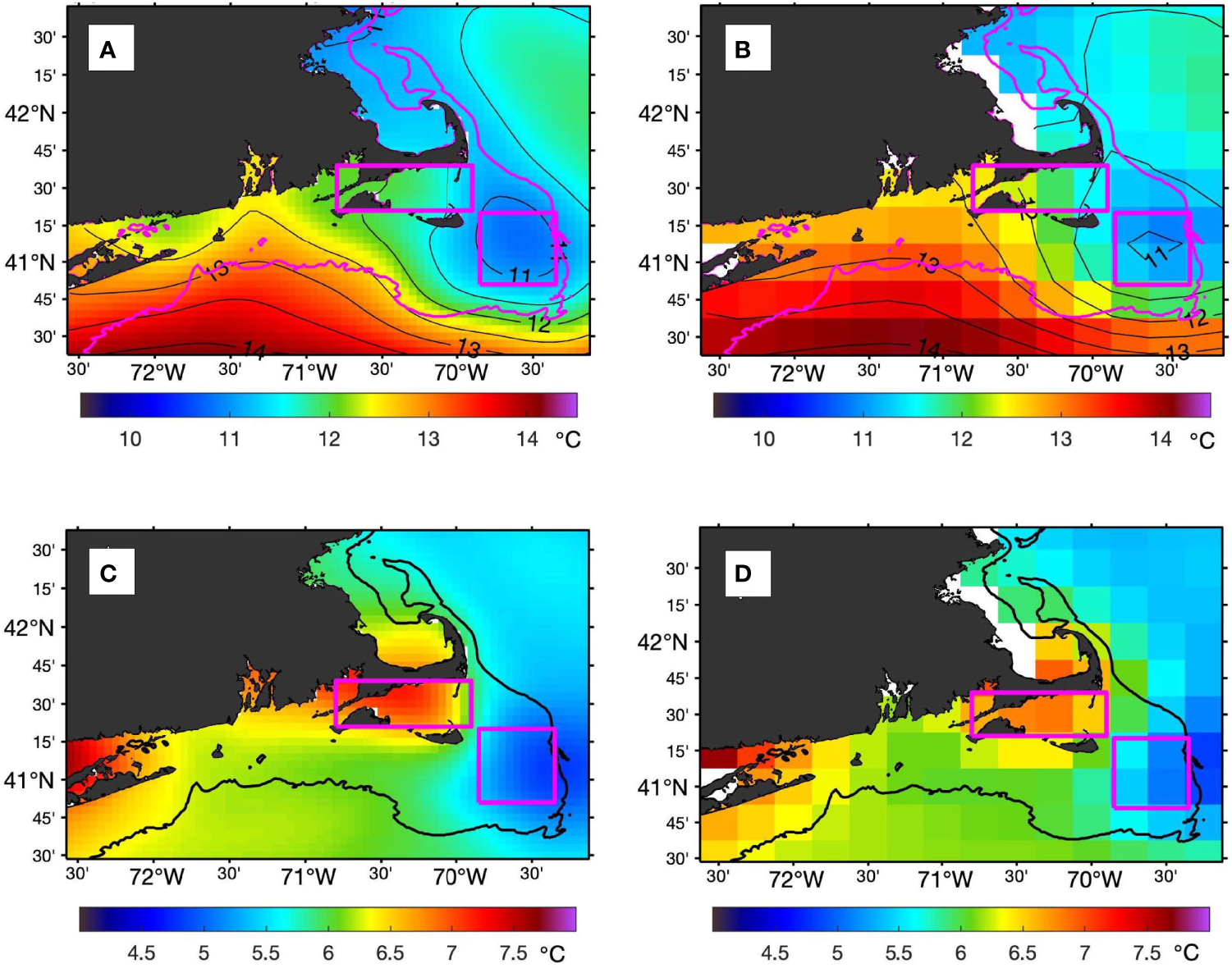 Spatial resolution does matter in representing SST annual variability in spatially heterogeneous near-shore waters. For instance, the SSTs on Nantucket Shoals (e.g. the square boxed area in Figure 2; refer to as Area I hereafter) are produced with 10 longitude by 10 latitude grid boxes in OSTIA, but with only 2 longitude by 2 latitude grid boxes in OISST. The SSTs in Nantucket Sound (e.g. the rectangle boxed area in Figure 2; referred to as Area II hereafter) are produced with 20 longitude by 7 latitude grid boxes in OSTIA, but with only 4 longitude by 1 latitude grid boxes in OISST. Clearly, the 0.05°-gridded OSTIA product provides more spatial context than the 0.25°-gridded OISST product.