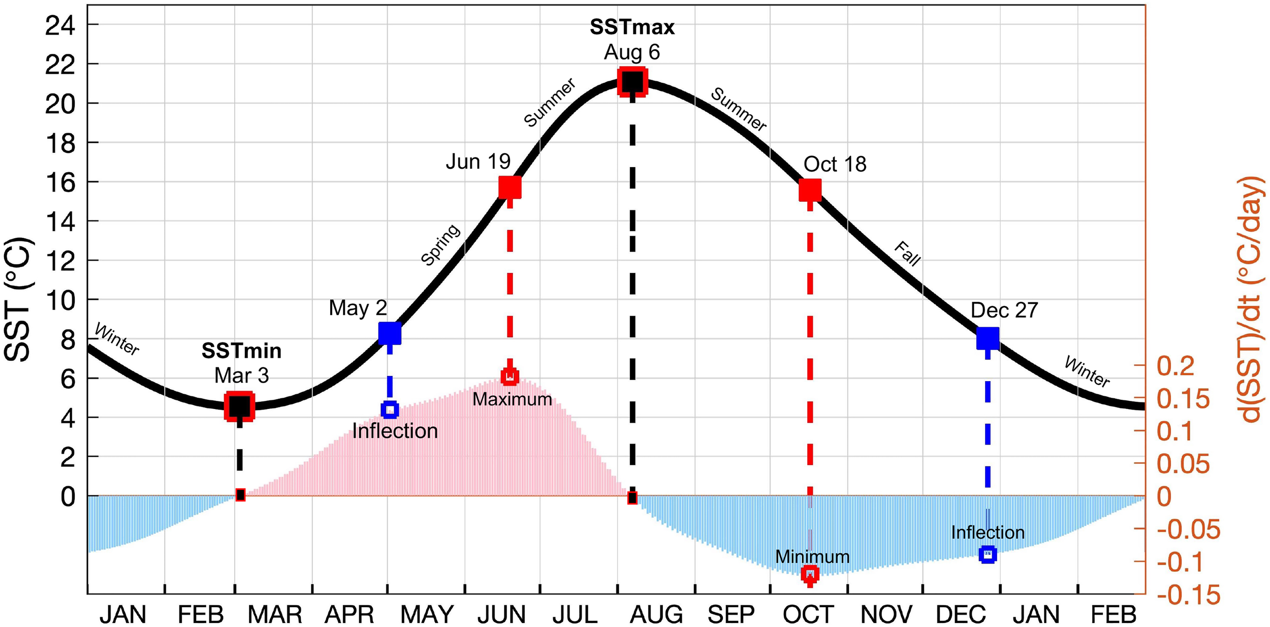 As shown in Figure 3, the first derivative of SST annual time series contains the information about the critical points of a continuous cycle. Three pairs of points are highly relevant to season transitions. The first is the two zero points, denoted by black squares with red outlines in Figure 3 with one at the end of February and the other in the early August. These points correspond to the timing of the occurrence of the coldest and warmest waters, that is, the SST extrema of the annual cycle. The second pair is the derivative maximum in mid-June and the derivative minimum in mid-October, denoted by solid and open red squares. These two points define the start and end of summer, and the round-up SST value at these two points is 16°CC. During this period, the rate of SST change goes straight downward, first from large positive to zero when the rate of SST increment decelerates day by day as SST climbs to the seasonal peak in early August, and then from zero to large negative when the rate of SST daily reduction accelerates as SST falls to conclude the summer. The third pair is the inflection points (i.e., local extrema), denoted by solid and open blue squares. An inflection point is a point at which the direction of curvature changes. One local minimum occurs in late December, marked by the beginning of slowing down in the rate of sea-surface cooling before SST approaches the seasonal minimum in late February. The another local maximum occurs in late April, marked by the beginning of acceleration in the rate of sea-surface warming after the winter ends. The two inflection points define the period of winter, and the round-up SST value at these two points is 8°C. Hence, the chosen SST thresholds for the start of winter and summer are 8°C and 16°C, respectively. The spring season is referred to the period that SST increases from 8°C to 16°C and the fall season is the period that SST decreases from 16°C to 8°C. Accordingly, the start date for spring in the regional shelf waters occurs on May 2, Summer on June 19, Fall on October 18, and winter on December 27. The warmest day of the year occurs on August 6 and the coldest day on March 3.