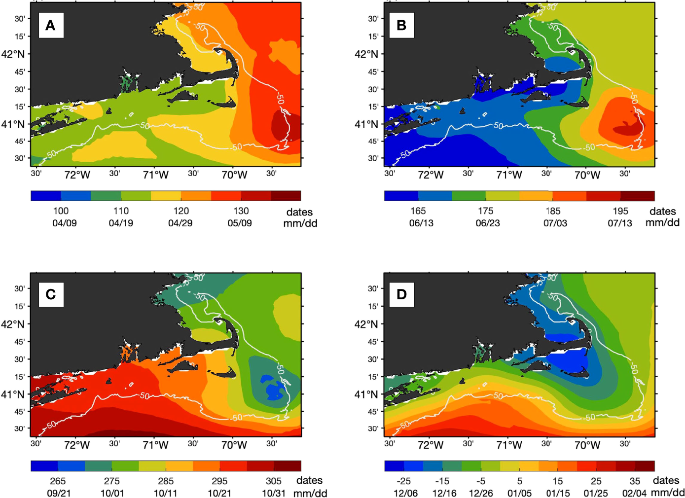 Mean onset date for (A) spring, (B) summer, (C) fall, and (D) winter on a climatological year constructed from OSTIA SST (2006-2020). Two sets of date strings are listed on the colorbar: the day of year (upper) and month/day (lower). The 50–meter isobath is highlighted in white.