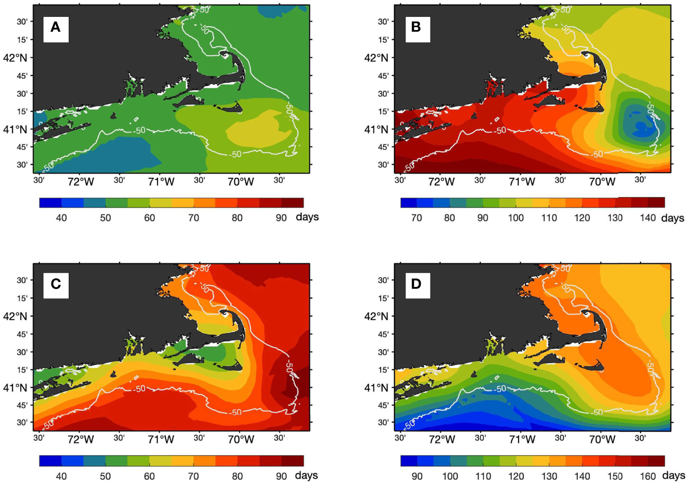 Mean length of the season (days) for (A) spring, (B) summer, (C) fall, and (D) winter on a climatological year constructed from OSTIA SST (2006-2020). The 50–meter isobath is highlighted in white.