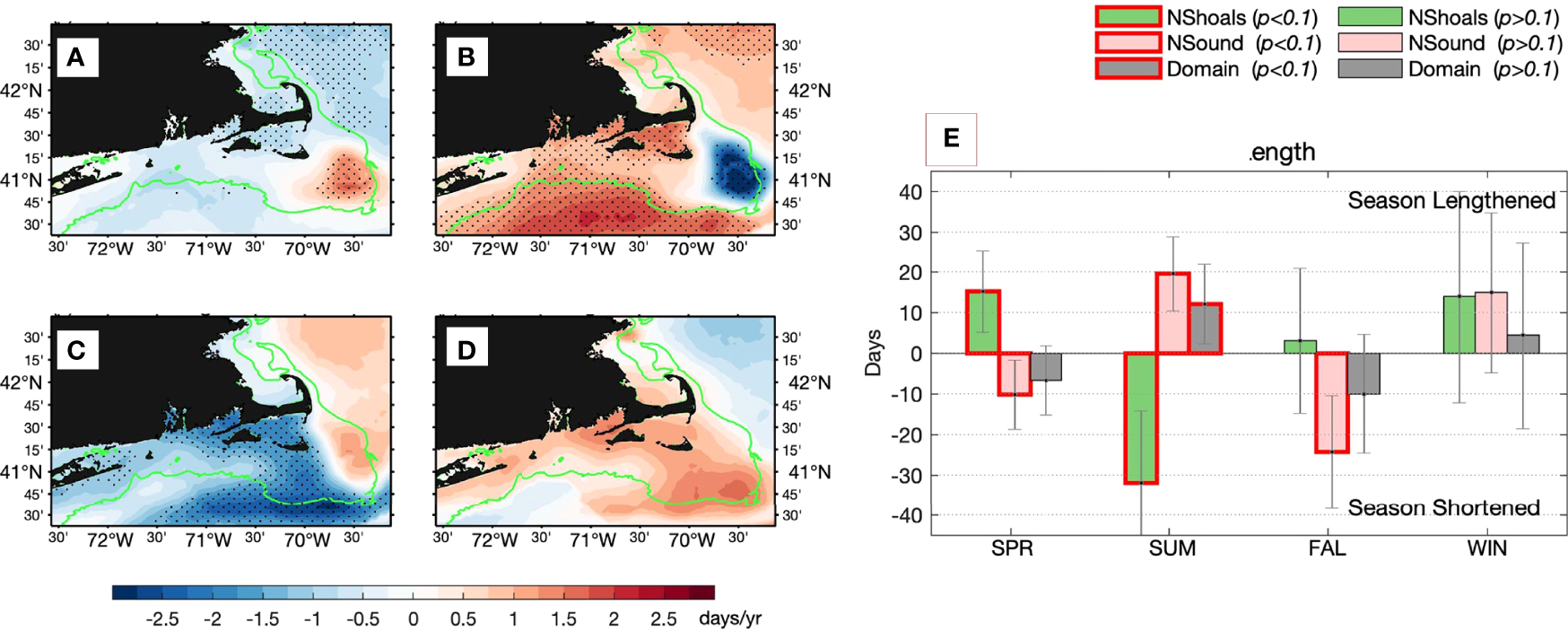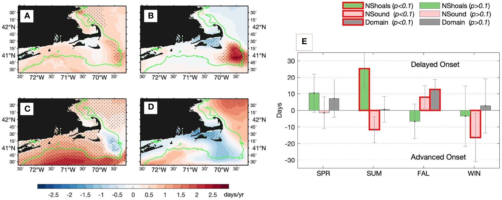 Linear trends in onset date (days/yr) for (A) spring, (B) summer, (C) fall, and (D) winter. Positive (negative) trends denote delayed (advanced) onsets. Areas with trends that are significant at 90% confidence interval are shaded by dots. The 50–meter isobath is highlighted in green. (E) Total shift in onset dates of the four seasons during 2006-2020. The three bars for each season denote the averages over the three respective areas (see Figure 2): Area I (Nantucket Shoals; green), Area II (Nantucket Sound, pink), and the study domain with Areas I & II excluded (gray). Red outlined bars denote the values are significant at 90% confidence interval.