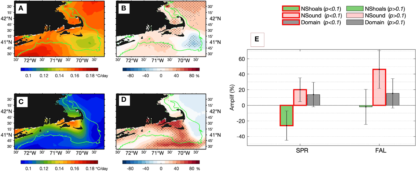 Positive PA value represents an acceleration of the SST transition rate, whereas negative PA value represents a deacceleration, or slowdown of the SST transition rate. The resultant PA patterns (Figures 8B, D) show that the spring warming rate has accelerated by 10-30% over the broad domain, with the exception in Nantucket Shoals where the warming rate has slowed down, in sharp contrast to the changes occurring elsewhere. The rate acceleration is statistically significant at the 90% confidence interval in the environs of Cape Cod and the GoM. In fall, the cooling rate has amplified on the southern New England shelf and weakened slightly in the GoM. The total changes in the PA values averaged over the three areas are summarized in Figure 8E and Table 1. In Area I (Nantucket Shoals), the SST transition rates have decreased by -26 ± 19% (p<0.1) in the spring but barely changed in the fall. In Area II (Nantucket Sound), the SST transition rates have increased by 20 ± 15% (p<0.1) in the spring and by 46 ± 24% (p<0.1) in the fall. The area emerges as a hotspot of accelerated season transitions on the inner shelf. The PA values averaged over Area III (the broad domain excluding Areas I &II) show that though SST transition rates have generally increased in both spring and fall, the basin averaged rates are not statistically significant because the spread (uncertainty) is large.