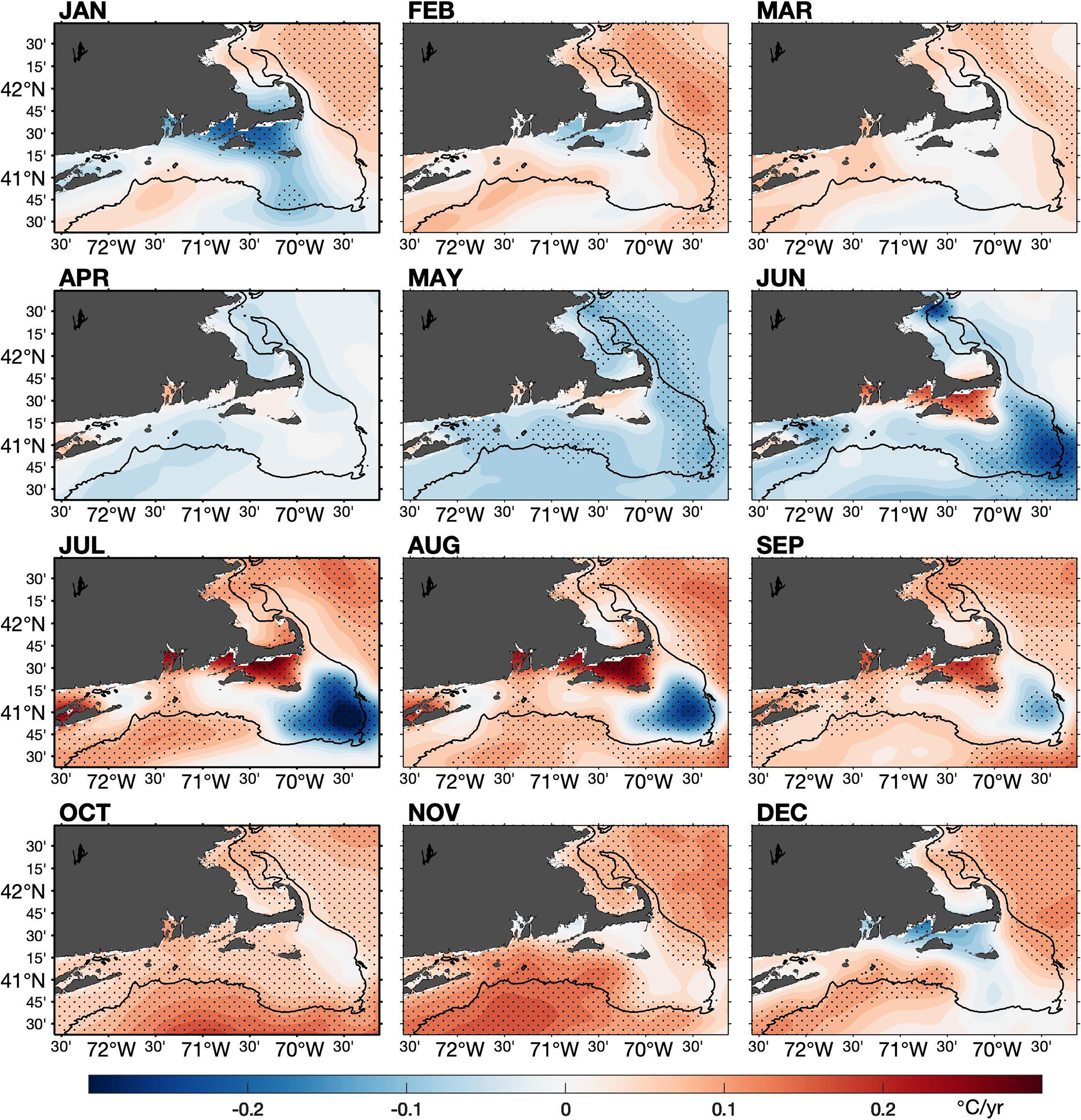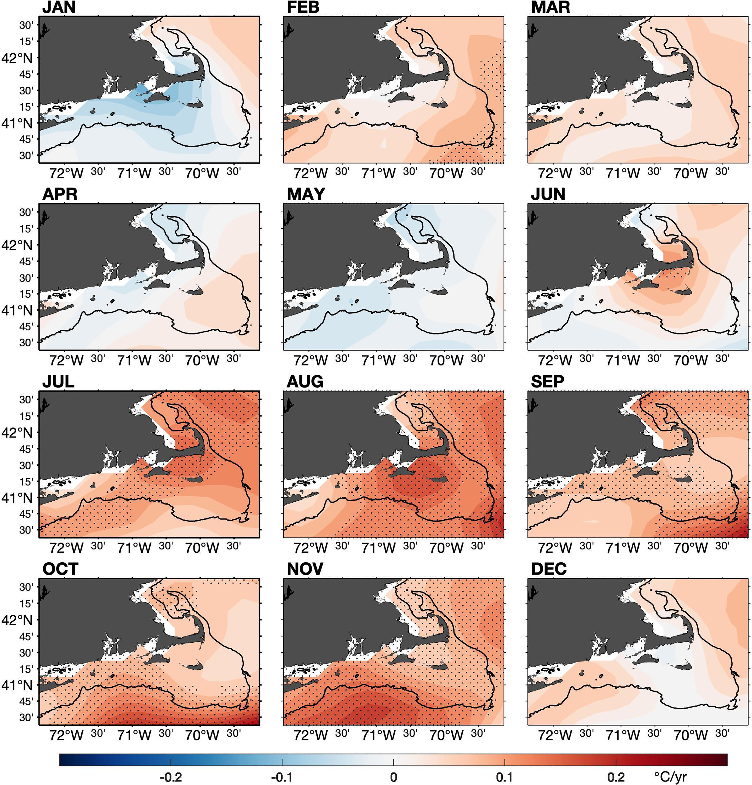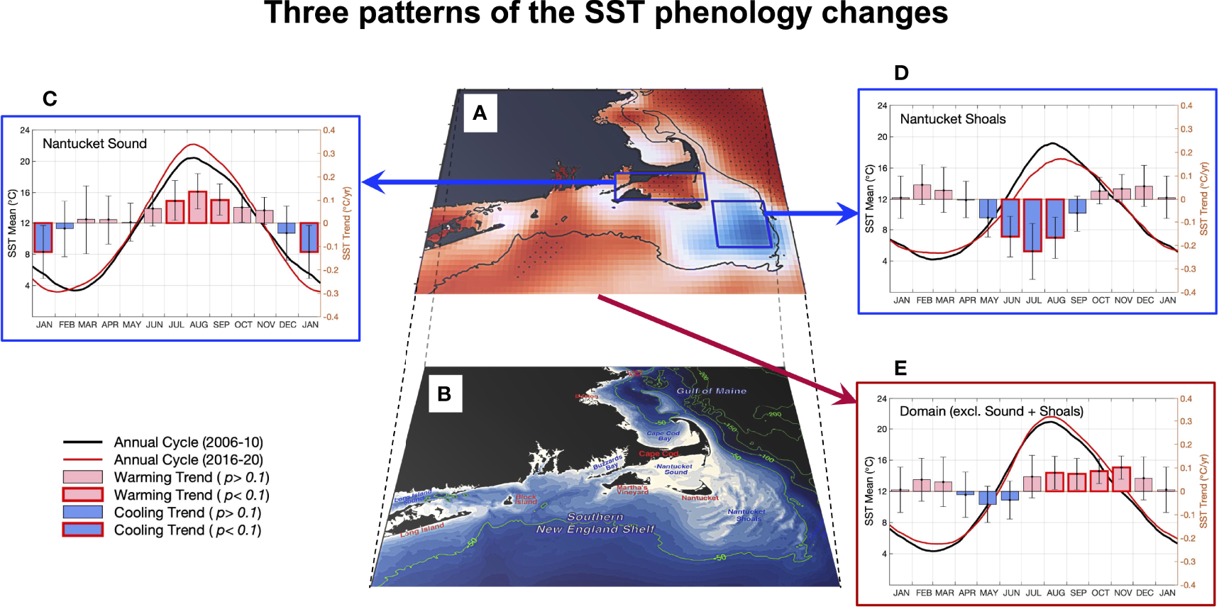 New England continental shelf warming, Cape Cod, phenology change of sea surface temperature, fine-resolution satellite observations, coastal warm spot, coastal cold spot