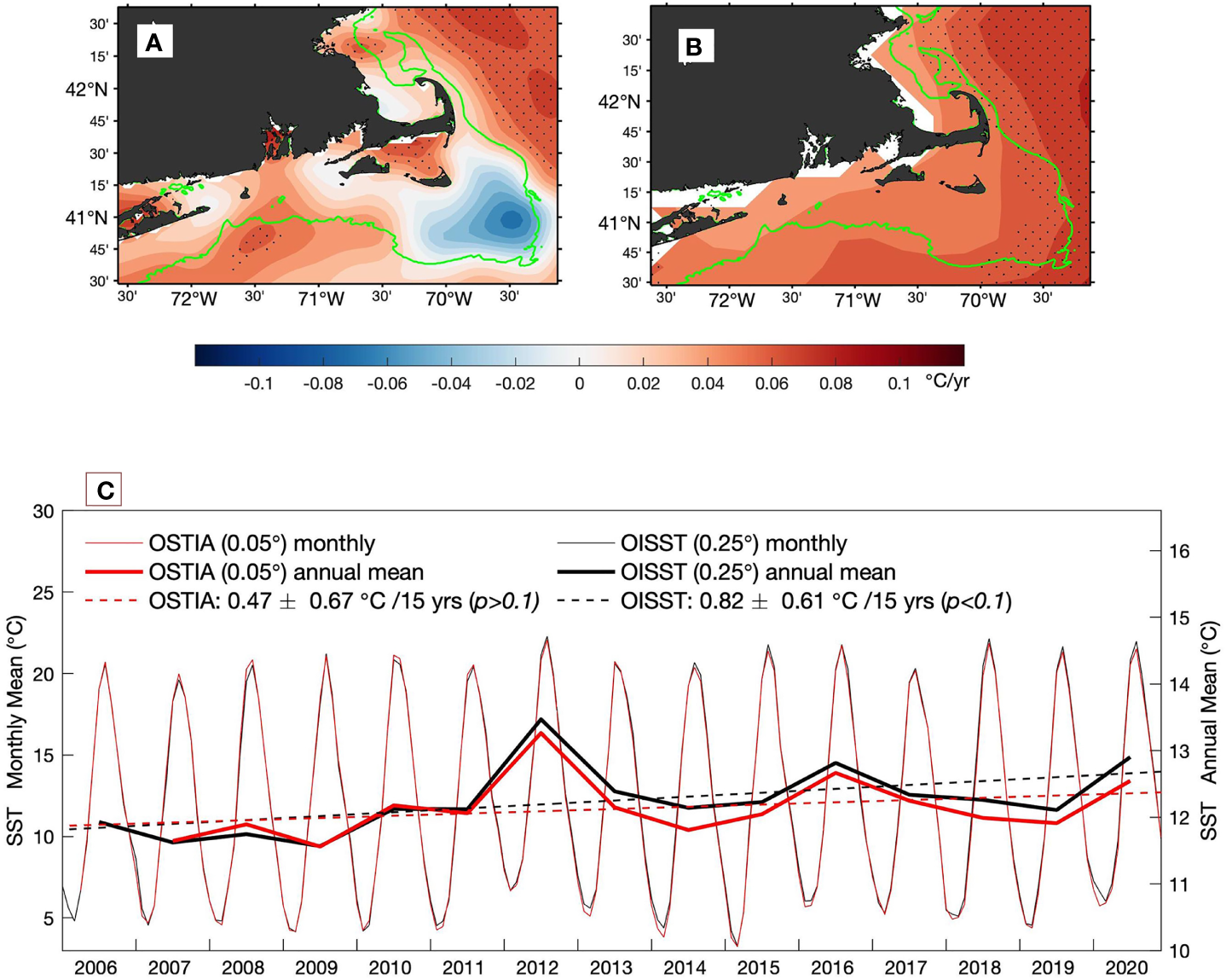 Although the fine resolution of the OSTIA SST allows a better resolving of SST variability in the environs of Cape Cod, the 15-year data span may not be sufficiently long enough to effectively isolate anthropogenic influence. Nonetheless, our literature survey shows that the rapid increase of the near-shore SST has occurred primarily in the recent decades. For instance, Forsyth et al. (2015) reported that the depth-averaged shelf temperature in the MAB region increases at 0.26 ± 0.01°C dec−1 from 1977 to 2013, but the trend since 2002 is at 1.1 ± 0.2°C dec−1, which is more than four times larger than the overall 37-year trend. Using a water temperature record of past 120 years in the GoM, Pershing et al. (2021) showed that temperatures rose in 1999 and then entered a period of rapid warming around 2005, with the mean temperature over the recent 5 years (2016-2020) being the highest on record. Hence, the 15-year OSTIA SST dataset provides an excellent opportunity to study the spatial heterogeneity of near-shore SST change during the rapid climate change of the recent decades.
