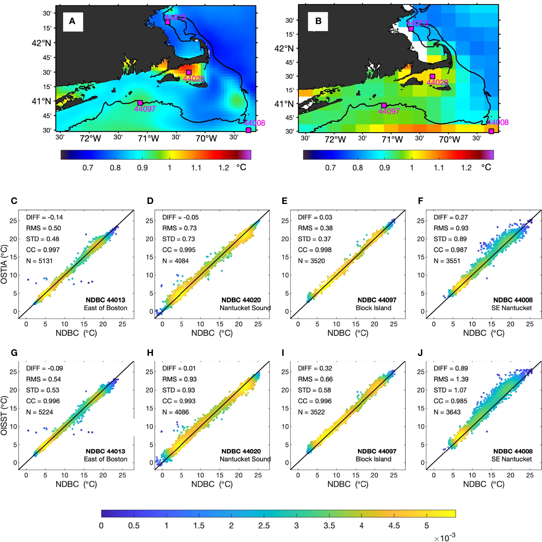 | 44020 | Nantucket Sound | 41.493N, 70.279W | 3-meter foam buoy | 14.3 | 1.5 | 2009 | NDBC | 3.1 ± 1.2 | -2.1 ± 2.2 |