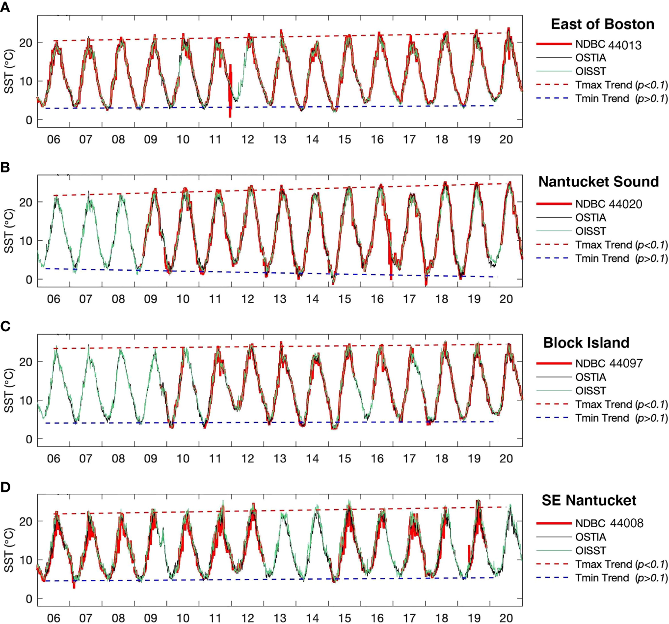 The bays and sounds surrounding the Cape and Island are small in size (< 50 km in width). For instance, Cape Cod Bay is 105 km long and 32 km wide, Nantucket sound 48 km long and 40 km wide, and Buzzards Bay 45 km long and 13 km wide. Despite the numerous studies of the warming in the NES waters as a whole, little attention has been paid to the water temperature changes in the environs of Cape Cod. The main limitation for studying Cape Cod is that sea surface temperature (SST) data products used in previous studies have a relatively coarse resolution, ranging from 1 – 2° grid resolution (~ 84 – 168 km at the latitude 41°C41′N of the Cape) (Friedland and Hare, 2007) to at best at 0.25° (~ 21 km) in recent studies (Mills et al., 2013; Pershing et al., 2015; Kavanaugh et al., 2017; Thomas et al., 2017; Chen et al., 2020). These spatial resolutions are adequate for defining the scale and scope of the warming on the continental shelf (Nixon et al., 2004; Friedland and Hare, 2007; Shearman and Lentz, 2010; Chen et al., 2014; Forsyth et al., 2015; Fulweiler et al., 2015; Oczkowski et al., 2015; Pershing et al., 2015), but insufficient to capture the SST variability in the small-sized nearshore areas around the Cape.