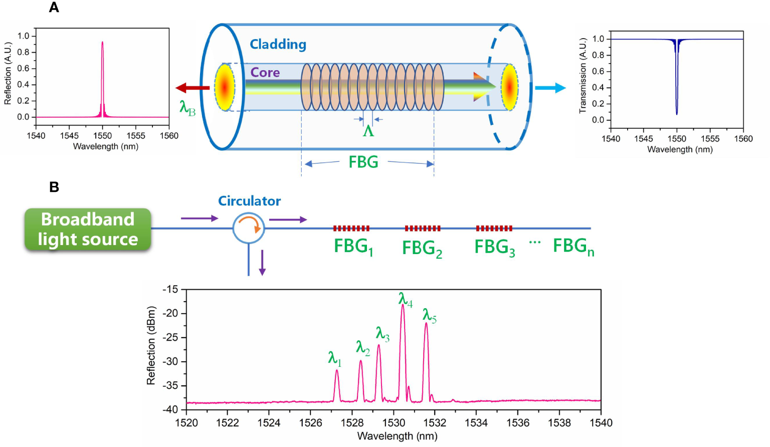 Schematic illustration of (A) working principle of the optical fiber Bragg grating (FBG) and (B) multiplexing principle of various FBG-based sensors.