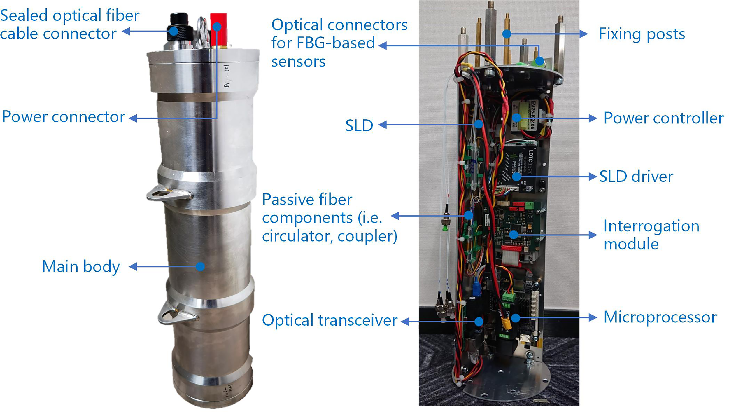 To realize and demonstrate the feasibility of the proposed submarine optical fiber sensing system, a prototype of the submarine interrogation system was developed based on the design illustrated in Figure 2. As shown in Figure 3, the entire system was designed in a cylinder made of stainless steel in an attempt to withstand high hydraulic pressure. The height, inner diameter, and outer diameter of the main body is 566, 120, and 132 mm, respectively, which however could be optimized to a smaller size by rearranging the modules inside. The main body was tested in a pressurized chamber of 15 MPa over 3 h, and no leakage was found, meaning that the system could be employed under the sea for over 1,000 m if leaving a pressure margin of one-third. Regarding the sensing capability, it is possible to carry various FBG-based sensors by connecting to the optical fiber connectors. The entire system possesses the external connection of optical fiber cable to implement the fast and real-time communication from the remote station, for instance, on the shore or the ship.