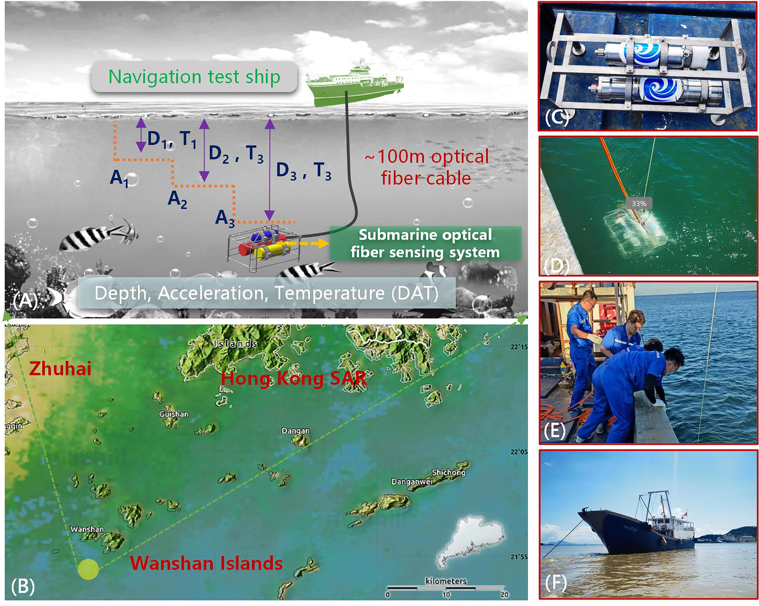 Illustration of the sea test conducted to verify the submarine optical fiber sensing system in a specific area close to Pearl River Estuary in China, where panel (A) is the test route employed to introduce three different conditions in terms of depth, acceleration, and temperature, panel (B) shows the test area near Wanshan Islands, and panels (C–F) are the photos captured during the field test.