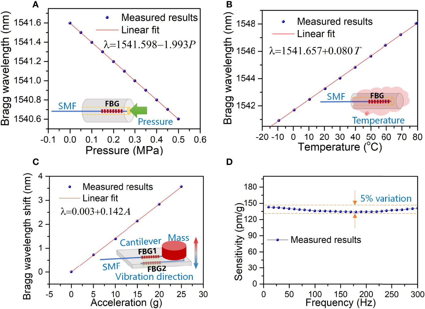 Experimentally measured responses of the pressure, temperature, and vibration sensors, where (A) and (B) are the Bragg wavelength as a function of pressure and temperature change, C shows the wavelength shift with respect to the applied acceleration of the vibration, and (D) plots the frequency response of the vibration sensor.