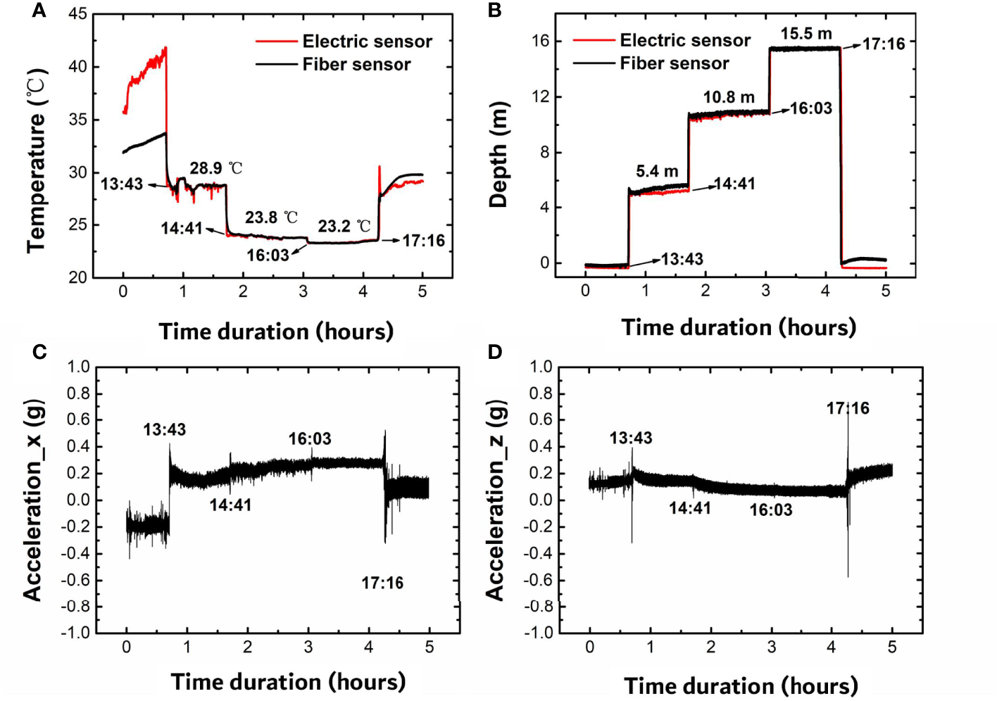 Measured results of the (A) temperature, (B) depth, and (C, D) acceleration by the submarine optical fiber sensing system under the sea.