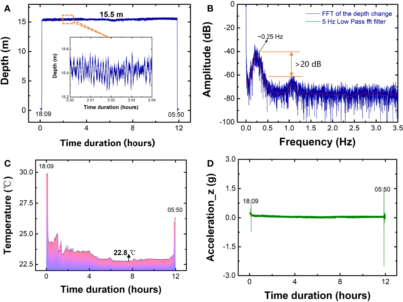 During the sea test, the submarine optical fiber sensing system was also maintained at a certain depth (~15.4 m) for over 12 h to test the long stability and to retrieve the dynamics of the surface water wave according to the monitored pressure. Figure 7 plots the monitored depth, temperature, and acceleration in a time duration over 12 h, starting at 18:09 of the testing day and ending at 05:50 the next day. The test was conducted overnight, during which the temperature basically decreases gradually with time. This is confirmed from the measured temperature as illustrated in Figure 7C, which shows the sea water temperature at the depth of ~15.4 m under the sea drops from ~25°C to the lowest point of ~22.8°C. The measured acceleration during this time duration keeps still, since the entire system was maintained at the same depth, except the starting and ending moments, where the vibration was caused during the movement of sinking and taking out. By taking a closer view of the depth change with time shown in the inset of Figure 7A, a periodic depth change can be observed clearly, which is supposed to be the result of the surface water wave. The fast Fourier transform of the depth change over time is plotted in Figure 7B, showing a prominent peak at the frequency of ~0.25 Hz with a signal-to-noise ratio of >20 dB. This frequency component falls into the range of ocean surface waves observed by the GPS-tracked buoys (Herbers et al., 2012). Thus, it is possible to employ the proposed submarine optical fiber sensing system to realize the real-time investigation of the surface water wave.