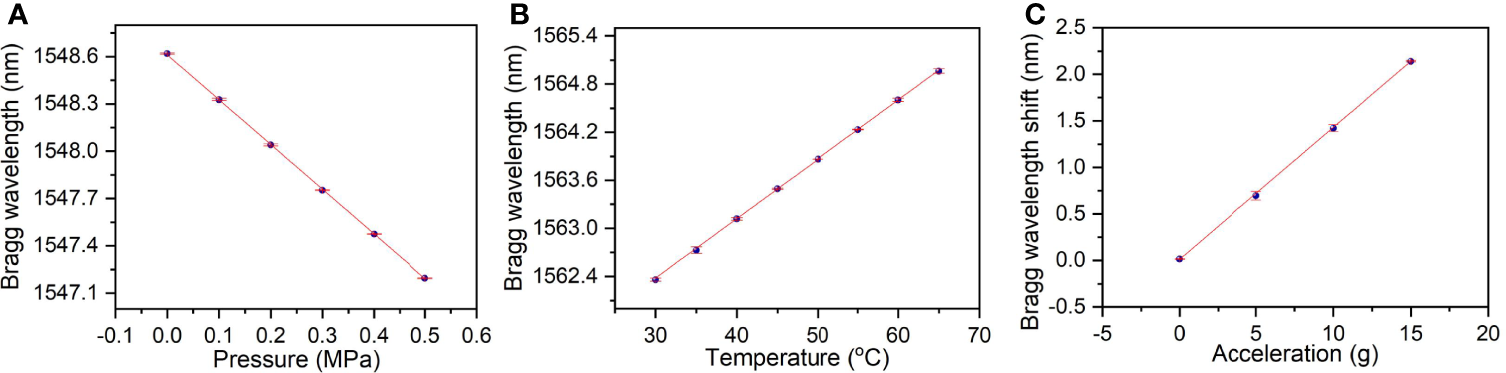 To further investigate the repeatability of the sensor performance, new batches of the pressure, temperature, and acceleration sensors were fabricated in a similar approach as the sensors presented above have been installed in the system and being under monitoring of the field test. The sensing responses were measured three times, as displayed in Figure 8, where the error bar presents the standard deviation of the repeatable measurements. The averaged wavelength deviation of the pressure, temperature, and acceleration measurement is ~0.004, ~0.01, and ~0.02 nm, respectively, corresponding to a measurement accuracy of ~2 kPa, ~0.1°C, and ~0.14 g. It is worth noting that the measurement accuracy could be enhanced further by establishing more precise calibration and demodulating the FBG spectra using deep learning method (Cao et al., 2022), which we are currently working on.
