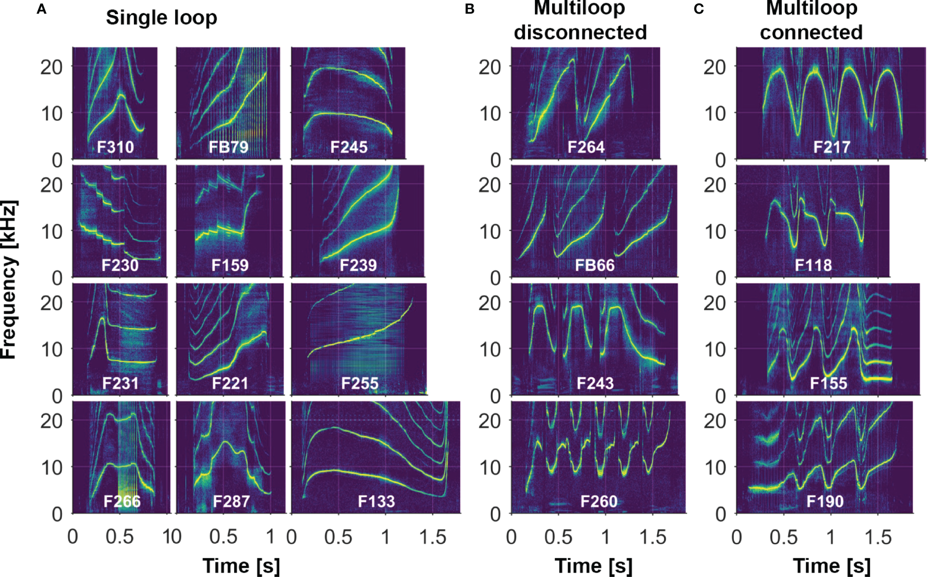Figure 2 Examples of different whistle contour types from a subset of Sarasota dolphins (see text for more detail; labels represent animal identification numbers): (A) Single-loop whistles consist of a single, non-repeated element. (B, C) Multi-loop whistles consist of variable numbers of repetitive elements, which can be disconnected (B) or connected (C). Shown here are examples of multi-loop whistles with identical loops (F264, F217), different introductory loop (FB66, F118), different terminal loop (F243, F155), and different introductory and terminal loops (F260, F190). [Note also the presence of steps in the contours of F230 and F159].