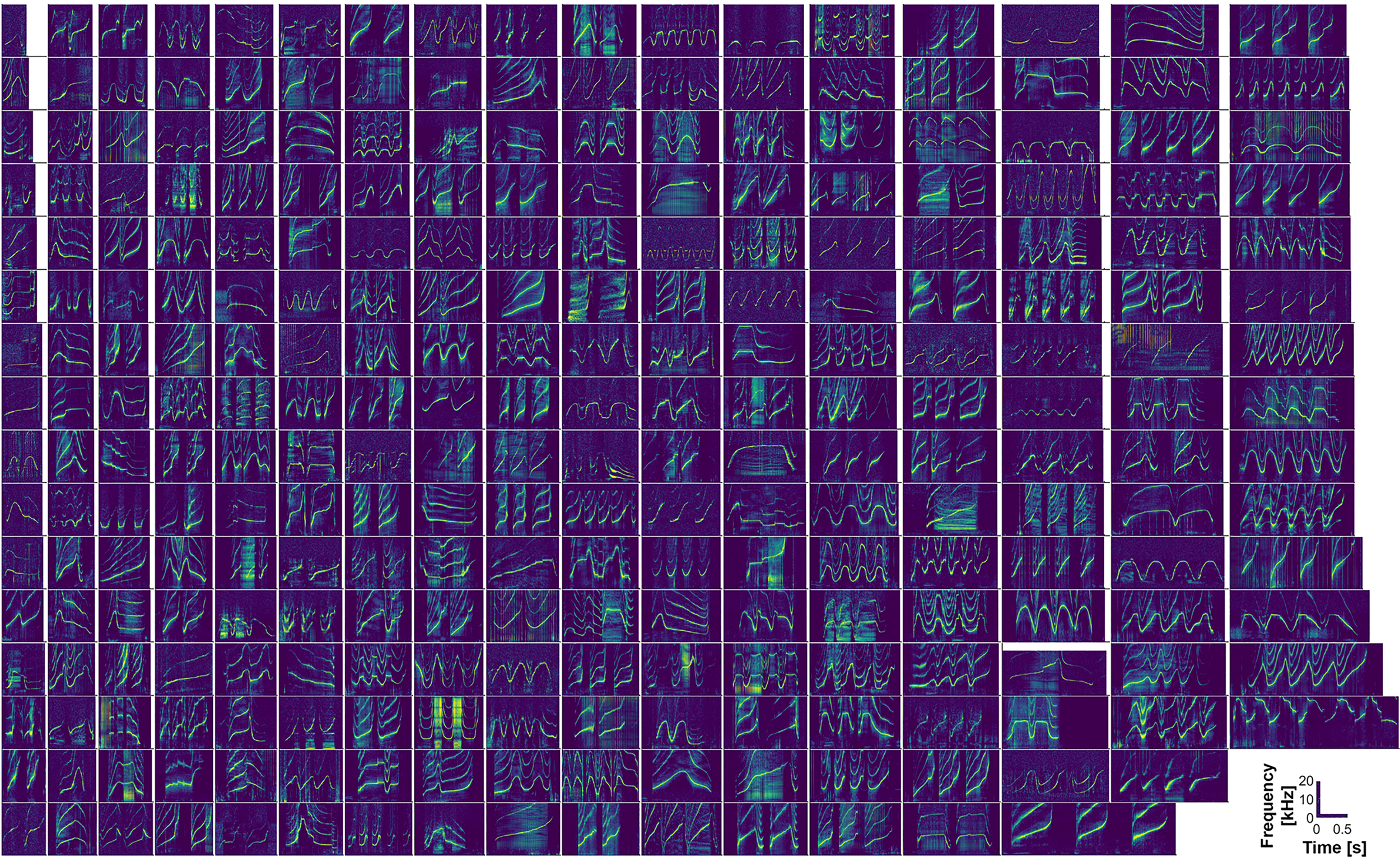 Figure 3 A single example spectrogram (48 kHz sample rate, 1024 pt Hanning window, 75% overlap) is plotted for each of 269 individual bottlenose dolphins. Whistles are sorted in columns based on increasing duration, and time and frequency axes are standardized.