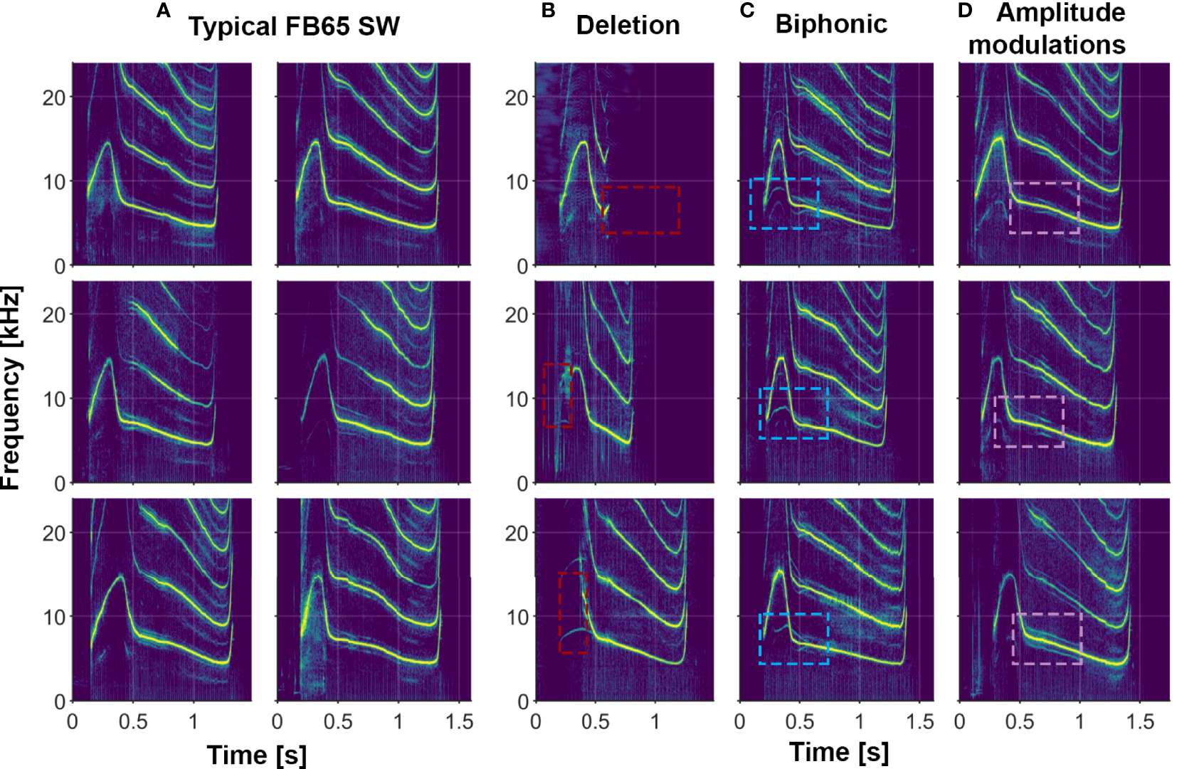 Figure 4 Examples of several whistle features in the signature whistles of a single animal (FB65). (A) Typical signature whistles; (B) Deletions where part of the signature whistle is omitted (marked by red boxes); (C) Biphonic vocalizations where a second independent contour is produced (marked by blue boxes); (D) Amplitude modulations that result in subtle spectral sidebands on either side of the fundamental frequency contour (marked by purple boxes).