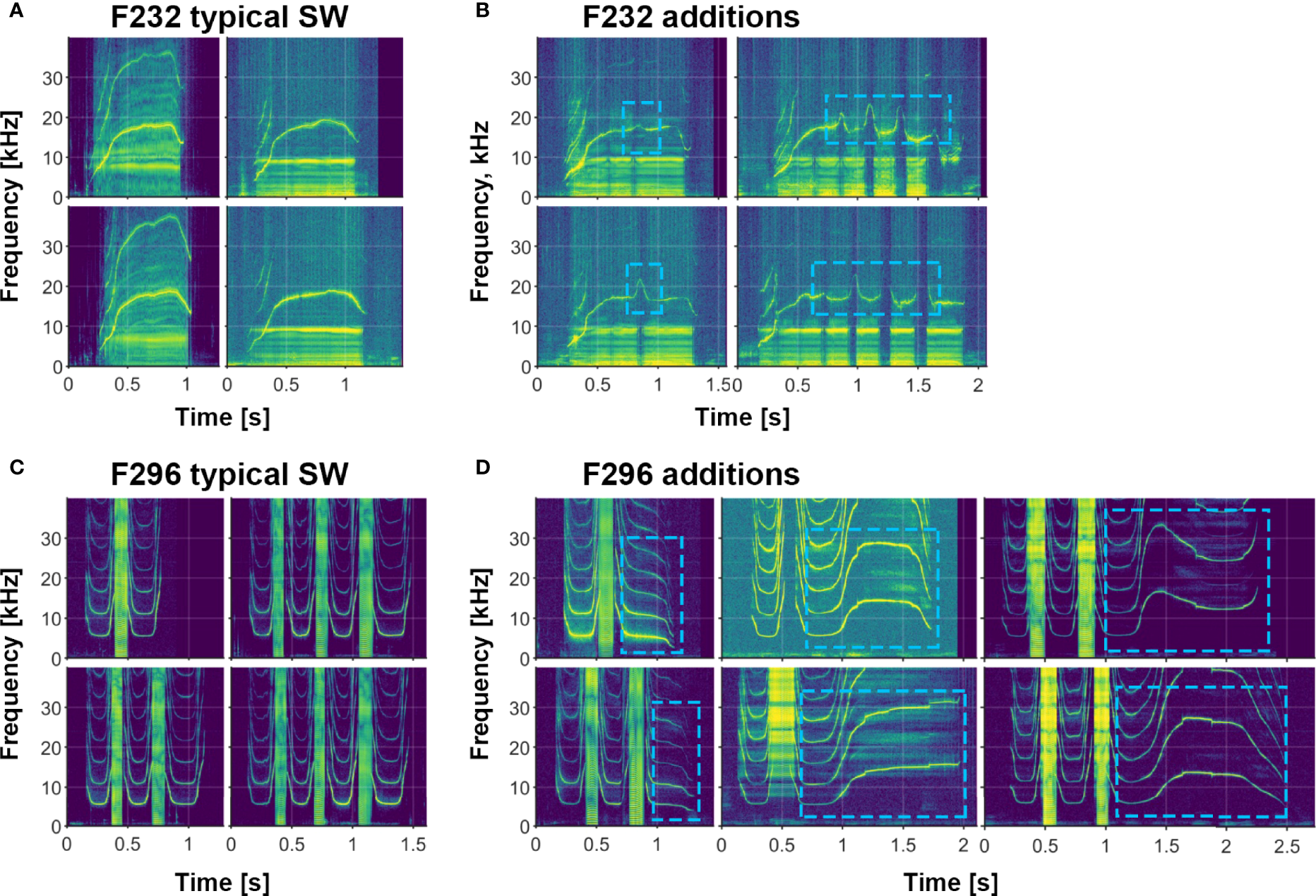 Figure 5 Examples of signature whistle additions and simultaneous burst-pulse components in two animals (F232 and F296). (A) Typical F232 signature whistle; note simultaneous whistle and burst-pulse components. (B) Signature whistle additions ranging from 1-4 inflections, all concurrent with gaps in burst-pulse component (marked by blue boxes). (C) Typical F296 signature whistle; note again concurrent burst-pulses. (D) Various additions (marked by blue boxes) that differ from the typical terminal loop.