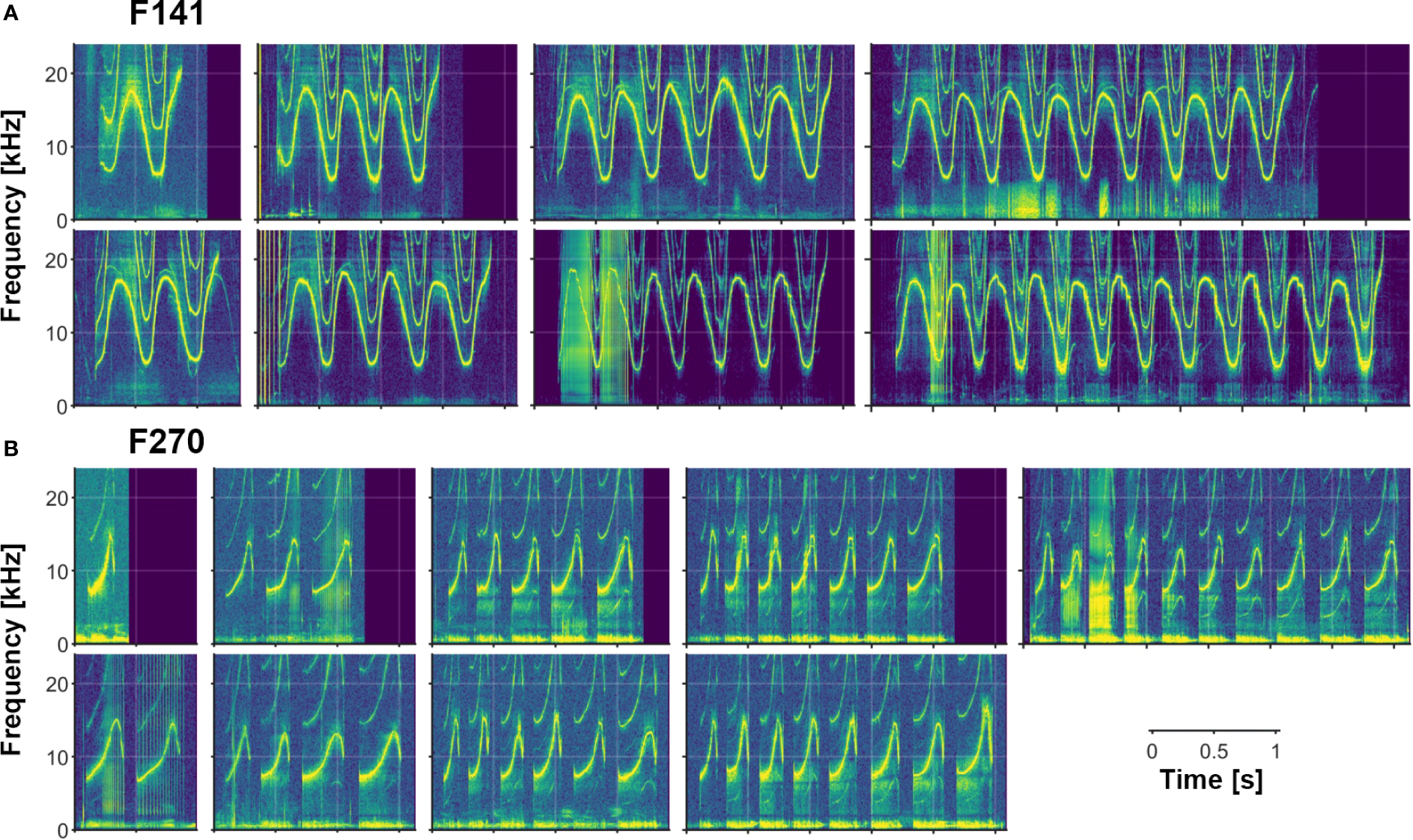 Figure 6 Examples of varying numbers of loops in multi-loop signature whistles. (A) F141 produces a connected multi-loop whistle containing 1 to at least 11 loops. (B) F270 produces a disconnected multi-loop whistle containing 1 to at least 10 loops (separated by typical inter-loop intervals; see text). [Note also subharmonics in many of F270’s whistles.].