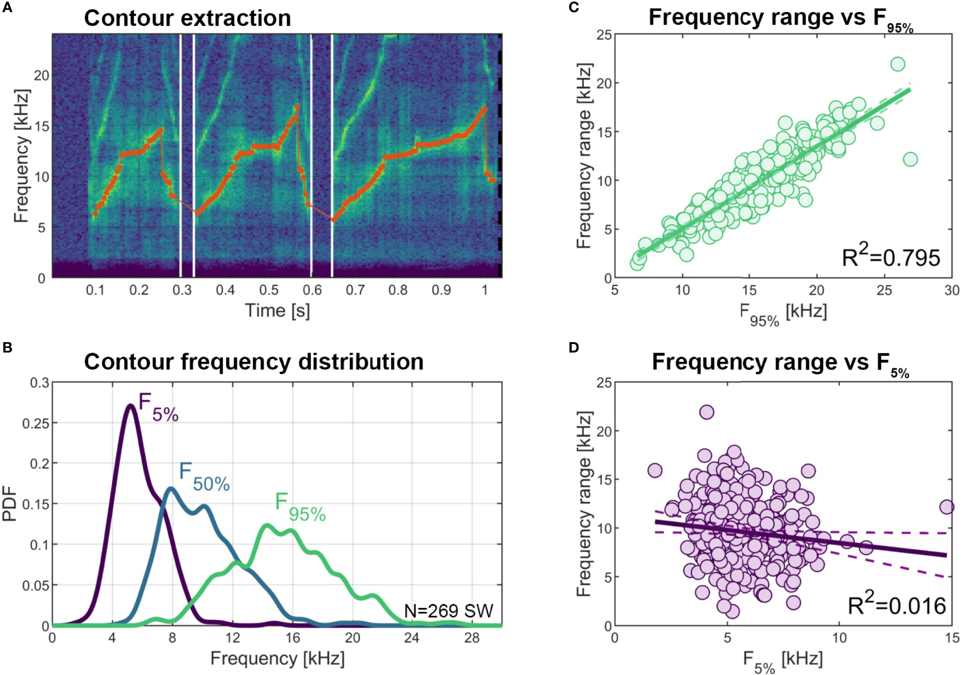 Figure 7 Variation in signature whistle contour frequency parameters. (A) Example spectrogram of a signature whistle with extracted fundamental frequency contour overlaid (red dots, 5 ms resolution). (B) Distribution (PDF: power density function) of lower 5th percentile, 50th percentile (median), and upper 95th percentile contour frequency across all 269 signature whistles. (C) Correlation between upper 95th percentile contour frequency and contour frequency range (calculated as the difference between 95th and 5th percentiles). (D) Correlation between lower 5th percentile contour frequency and contour frequency range.