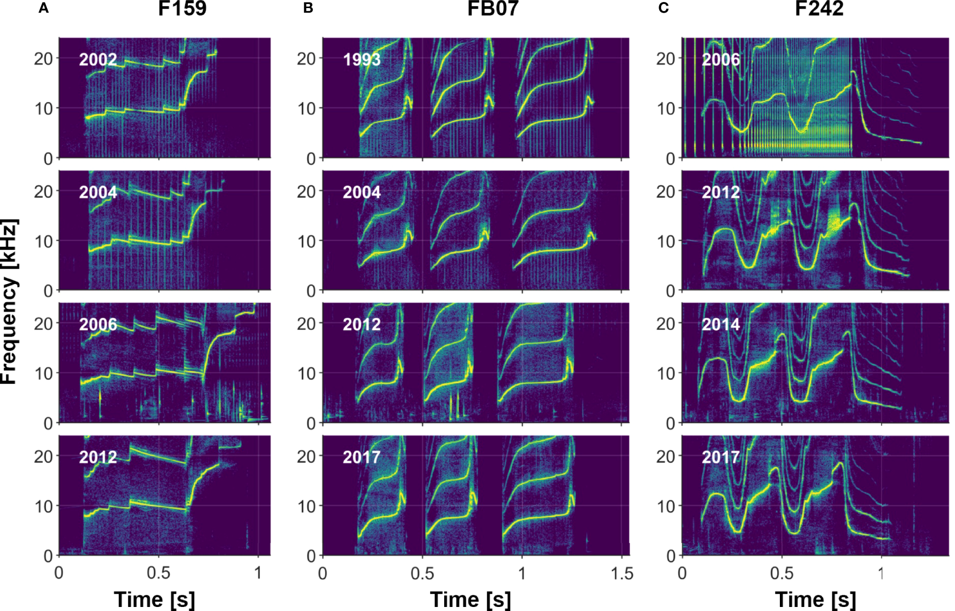 Figure 8 Three examples of individuals recorded across 10 or more years, illustrating signature whistle stability. (A) Female F159, who produces a single-loop whistle; (B) Female FB07, who produces a multi-loop disconnected whistle; and (C) Male F242, who produces a multi-loop connected whistle.