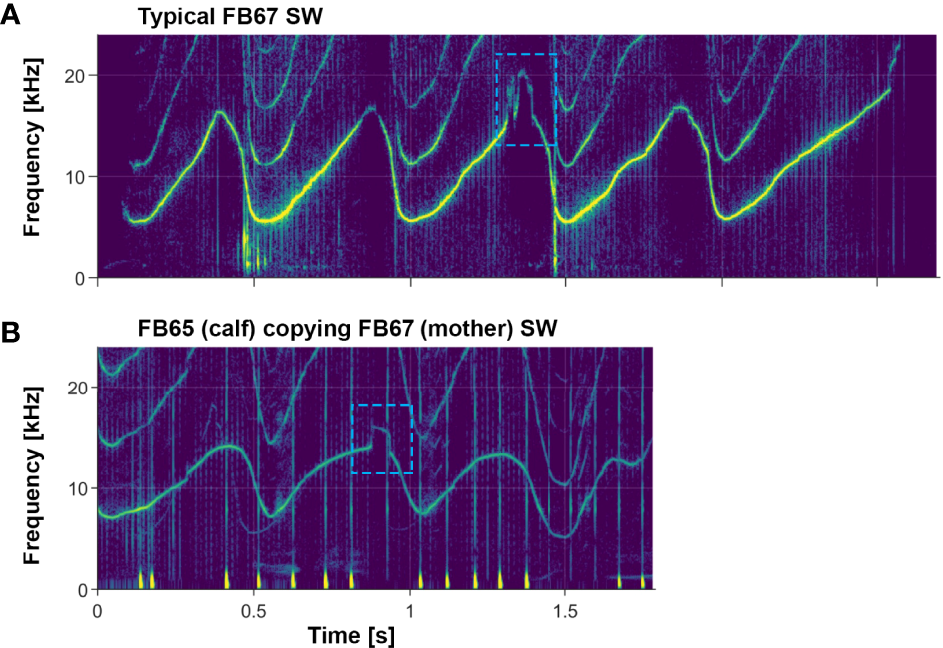 Figure 10 Example of a subtle whistle feature being preserved in a signature whistle copy. (A) Signature whistle of FB67, an adult female; she sometimes includes a subtle feature as seen in the 3rd loop of her whistle (blue dashed box). (B) Copy of FB67’s signature whistle emitted by her daughter FB65. Note the preservation of the subtle feature (blue dashed box) in the 2nd loop of the signature whistle copy. The faint whistle in the background is FB67 emitting her own whistle. Examples of FB65’s own signature whistle can be seen in Figure 4.