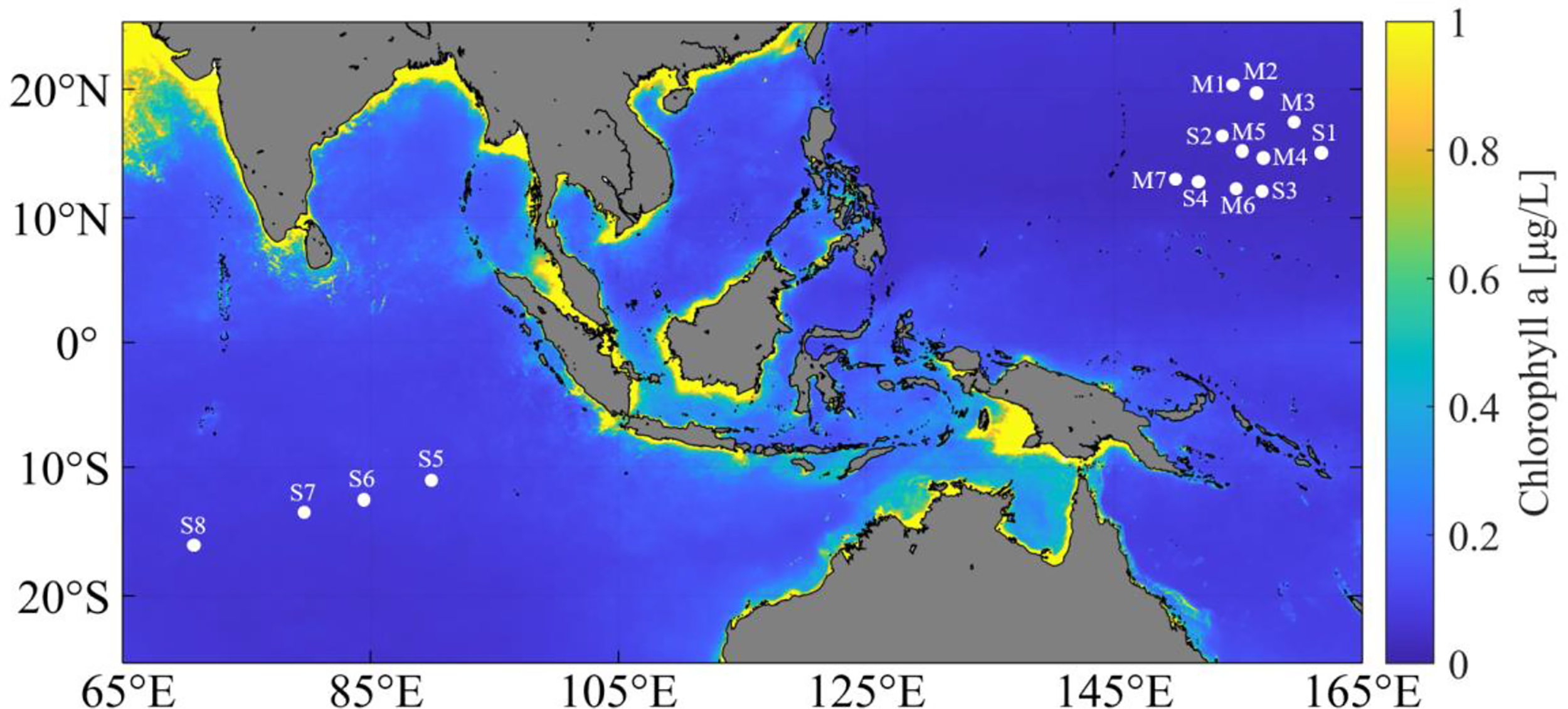 Location of sampling sites. M1-M7 & S1-S4, sampling sites in the West Pacific Ocean. S5-S8, sampling sites in the Indian Ocean. The surface chlorophyll a concentration (mg/L) shown in this map is the annual average value from 2019 to 2020 (obtained from the MODIS-aqua 4 km data set).