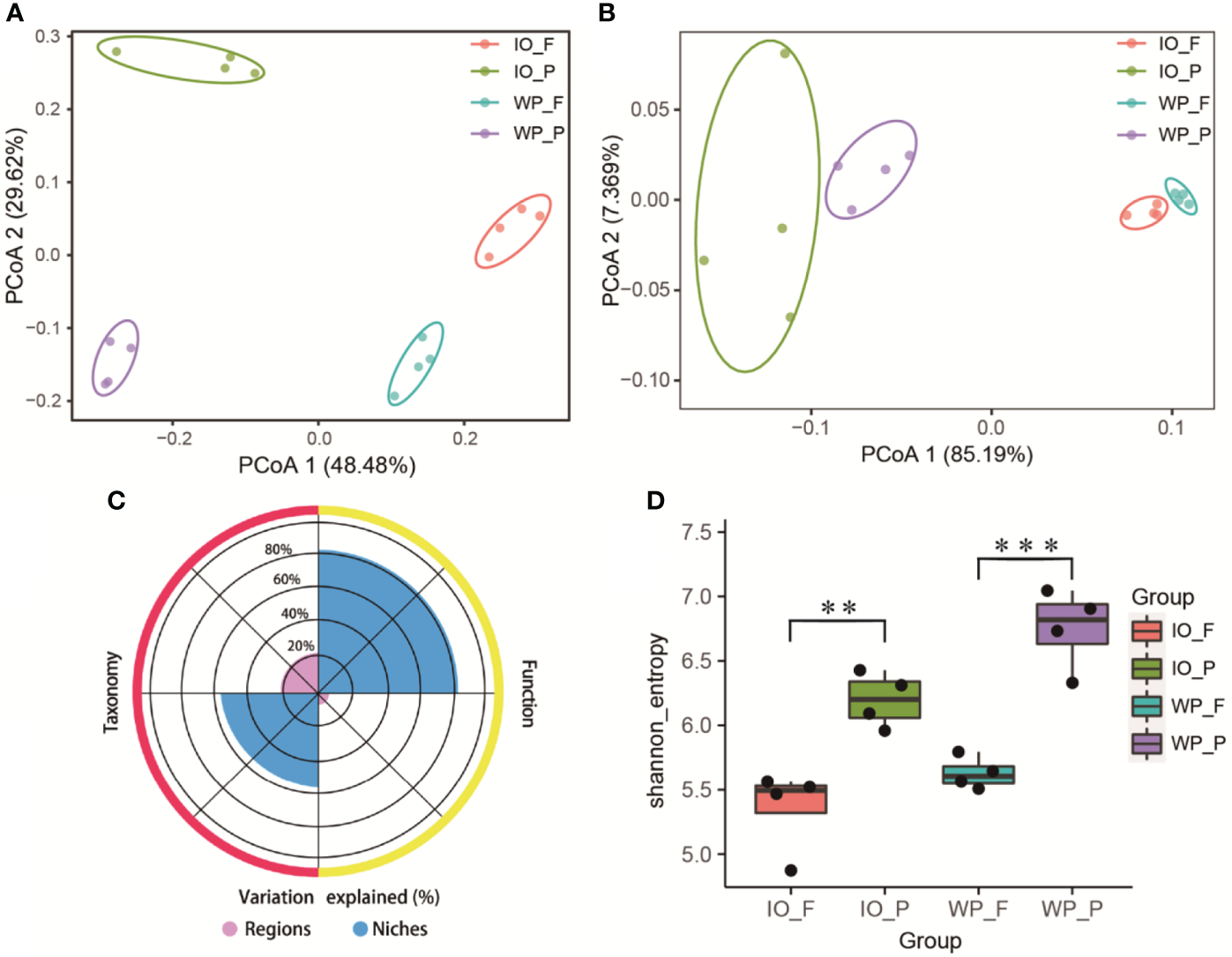(A) Prokaryotic community structure (genus level) and (B) functional profile (based on eggNOG annotation) differences of PA and FL assemblages revealed by 16S rRNA gene amplicon sequencing and metagenomics, respectively. (C) Variances of community structure and functional profile explained by oceanic regions and PA and FL niches. (D) Differences in Shannon index between PA and FL communities. IO, Indian Ocean. WP, West Pacific Ocean. Asterisks represent the following statistical significance: **0.001 ≤ P < 0.01; ***P < 0.001.